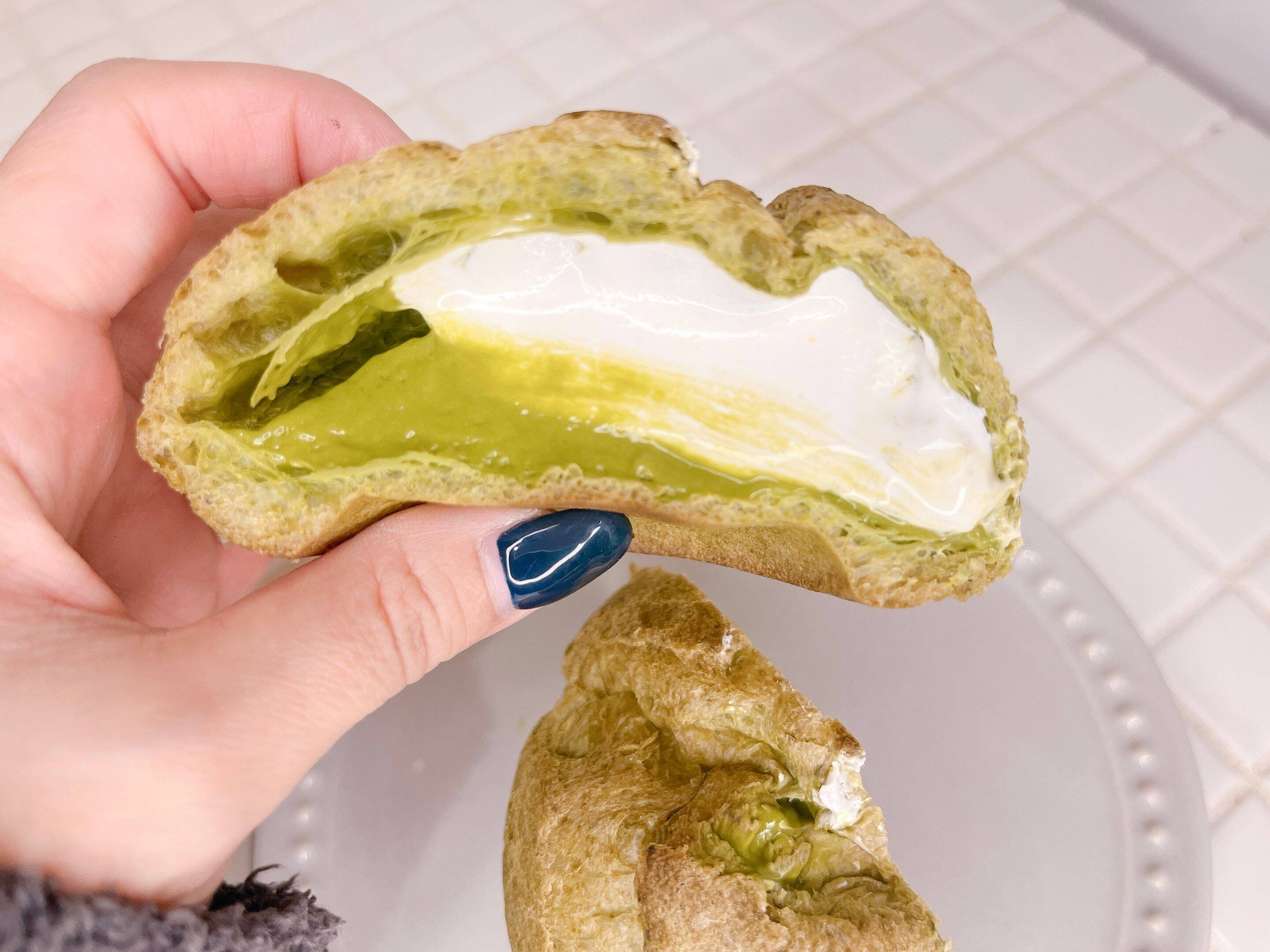 半分に切ってみましたが、溢れんばかりのクリームがぎっしり詰まっています。抹茶のクリームとホイップクリームの2種類のクリームが入っているのでお得感!