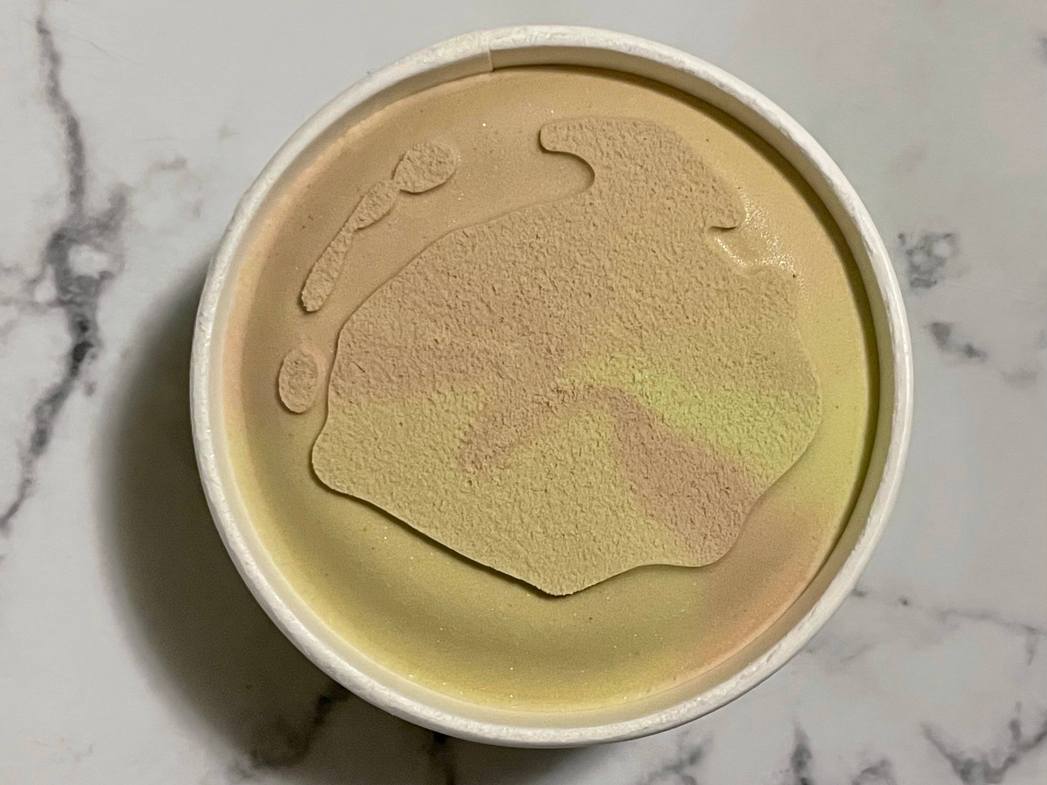 蓋を開けると、チョコレートとピスタチオカラーがマーブル状に入っています。