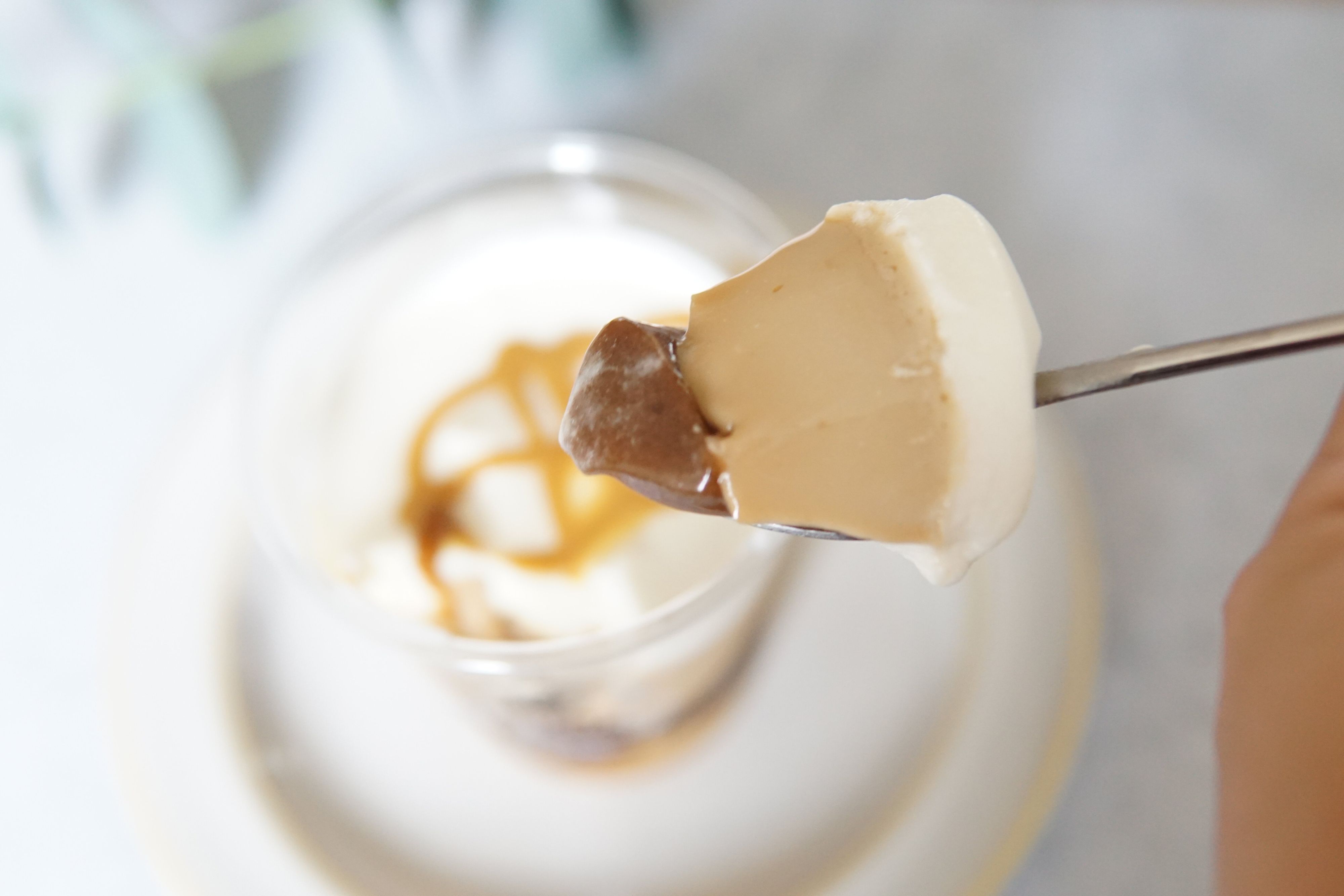 キャラメルミルクプリンは、舌にのせるととろけるくらいの柔らか食感。まろやかで甘く、上にのっているホイップとあわさることで、ミルク感が強く感じられます。そして、その下にある珈琲ゼリーは一口大にカットされていて、わらび餅とゼリーの中間といった具合のちゅるんとした弾力。珈琲の風味やほろ苦さが感じられます。