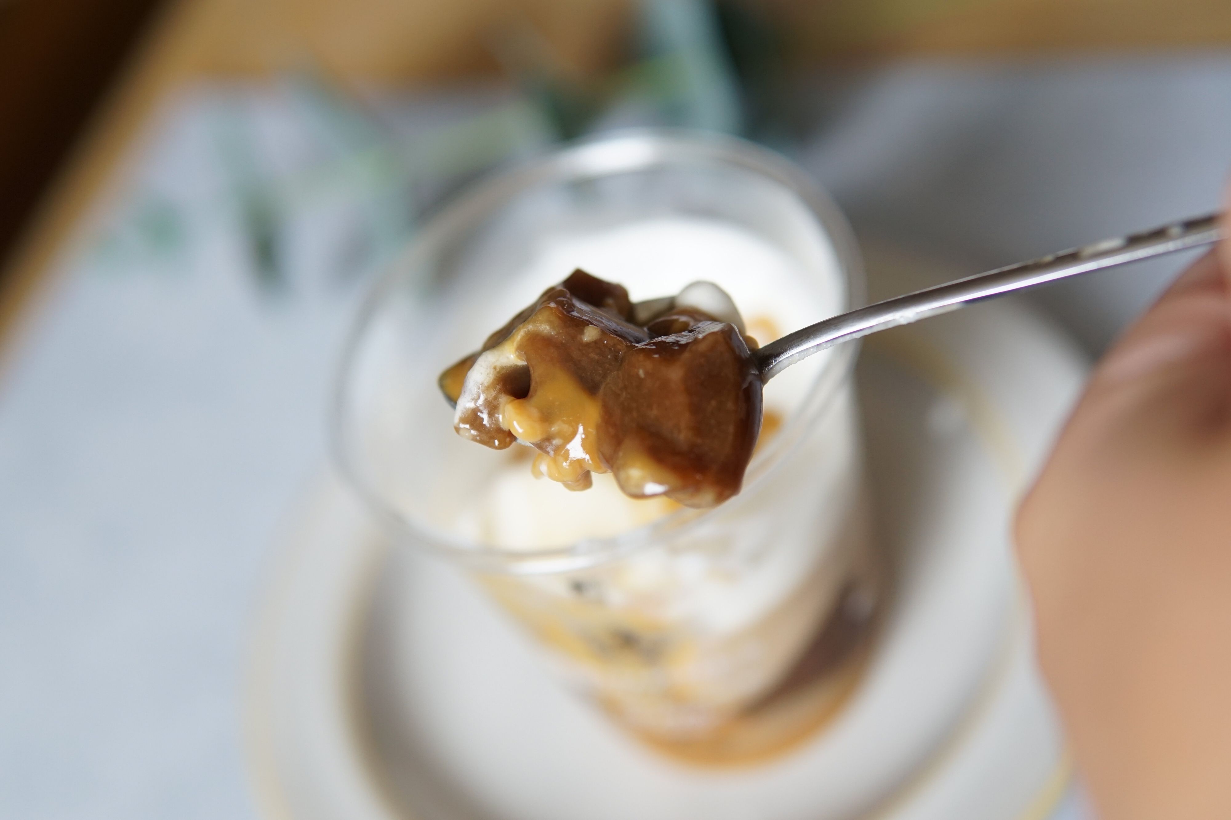 底のほうには、キャラメルらしいさらなる濃厚な甘味とコクが感じられる塩キャラメルソースが入っており、横から見ると色味もグラデーションがかっていて美しいです。少し甘すぎるのではないかと思うくらいの深い甘みを感じながらも、珈琲のほろ苦さにも引っ張られて、どんどんと食べ進めてしまう、そんな魅力を持っていました。