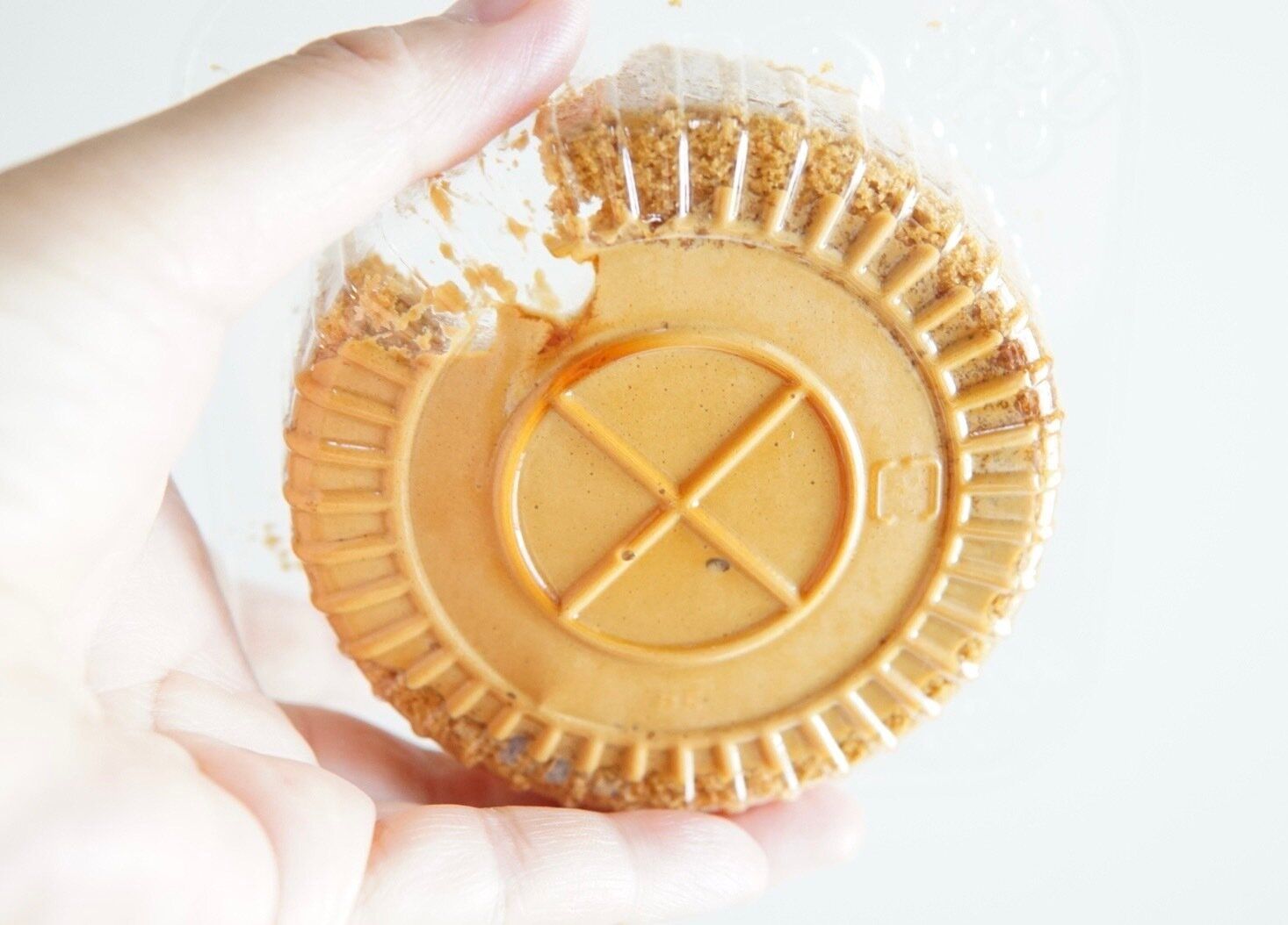 上から見ると気づきませんが、ミルク感あるやさしい味わいのとろっとしたカスタードクリームが上、下には香ばしい苦みが特徴の塩キャラメルクリームの2層になっています。下から見ると、塩キャラメルクリームの存在が確認できますよ。