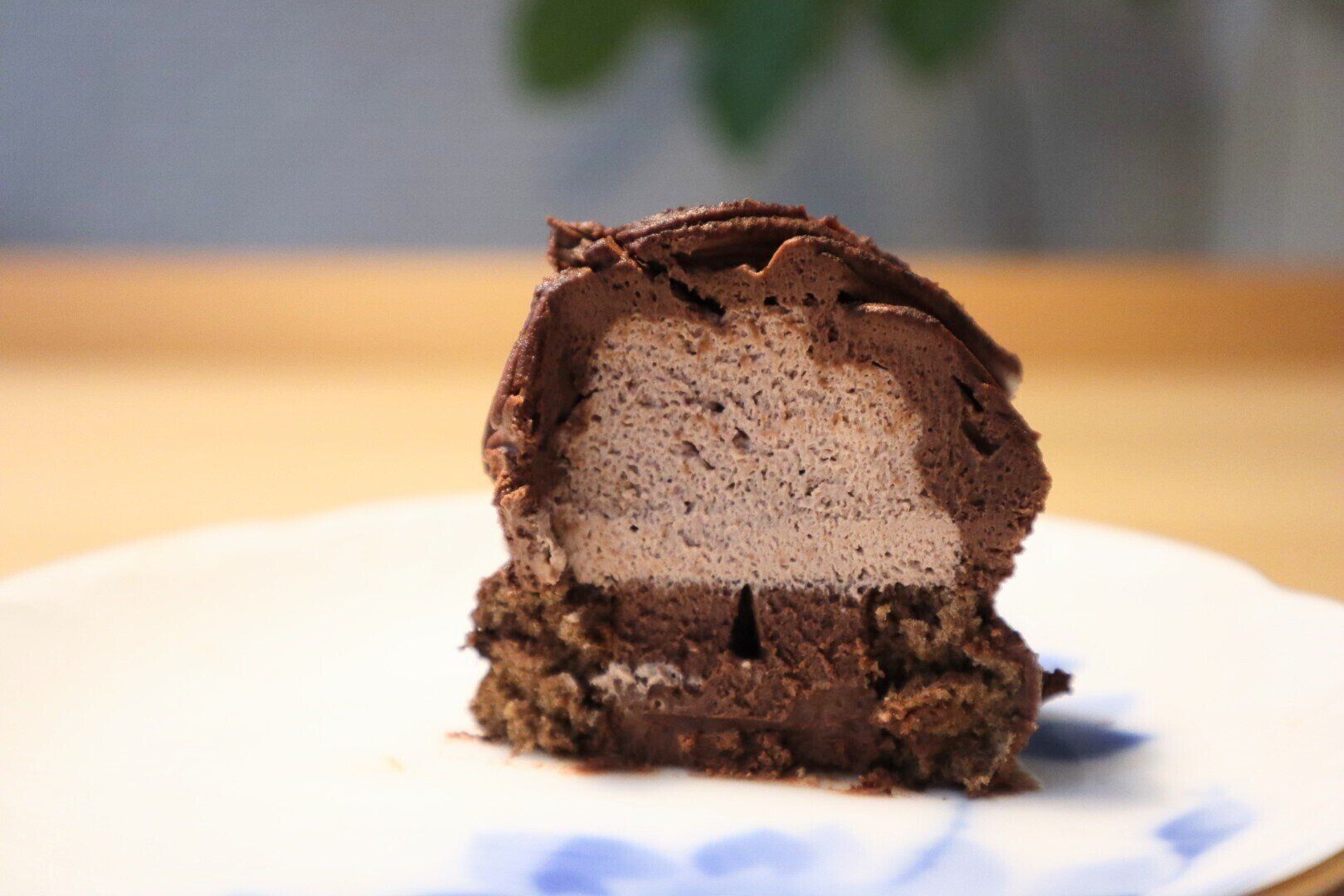 外側を取り巻く濃厚なチョコクリームを食べ進めていくと、中には軽いくちどけのチョコホイップがぎっしり!下層部にはしっとりとしたチョコロールケーキが見え隠れしていますが、このチョコロールケーキが占める割合が少ないので、重く感じず、夏でもどんどん食べられます。