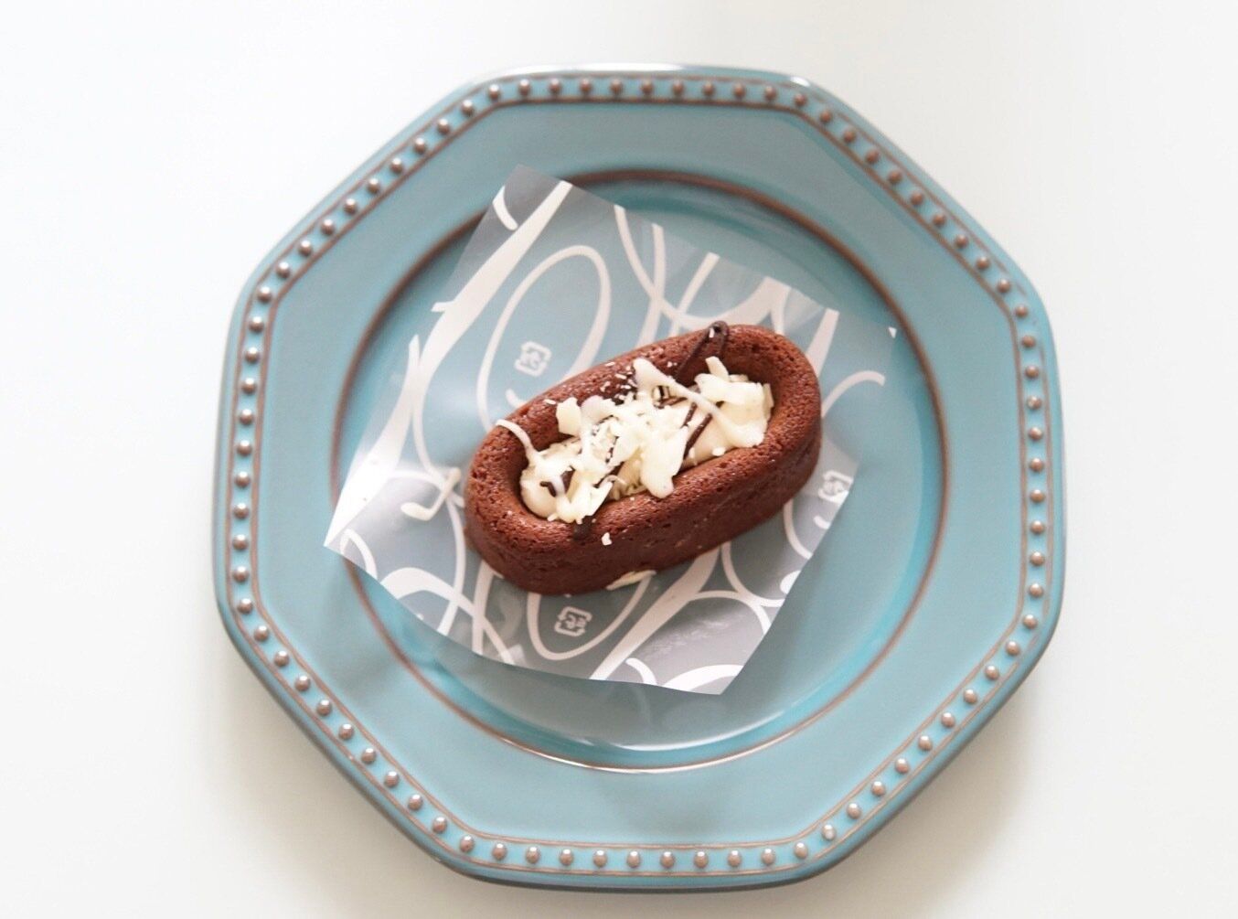 チョコソースとホワイトチョコソース、そして細かいホワイトチョコをパラパラとトッピング。パッケージで表現されているイラストのように、まるで白い花が咲いたかのような華やかさに見た目にも引き込まれます。