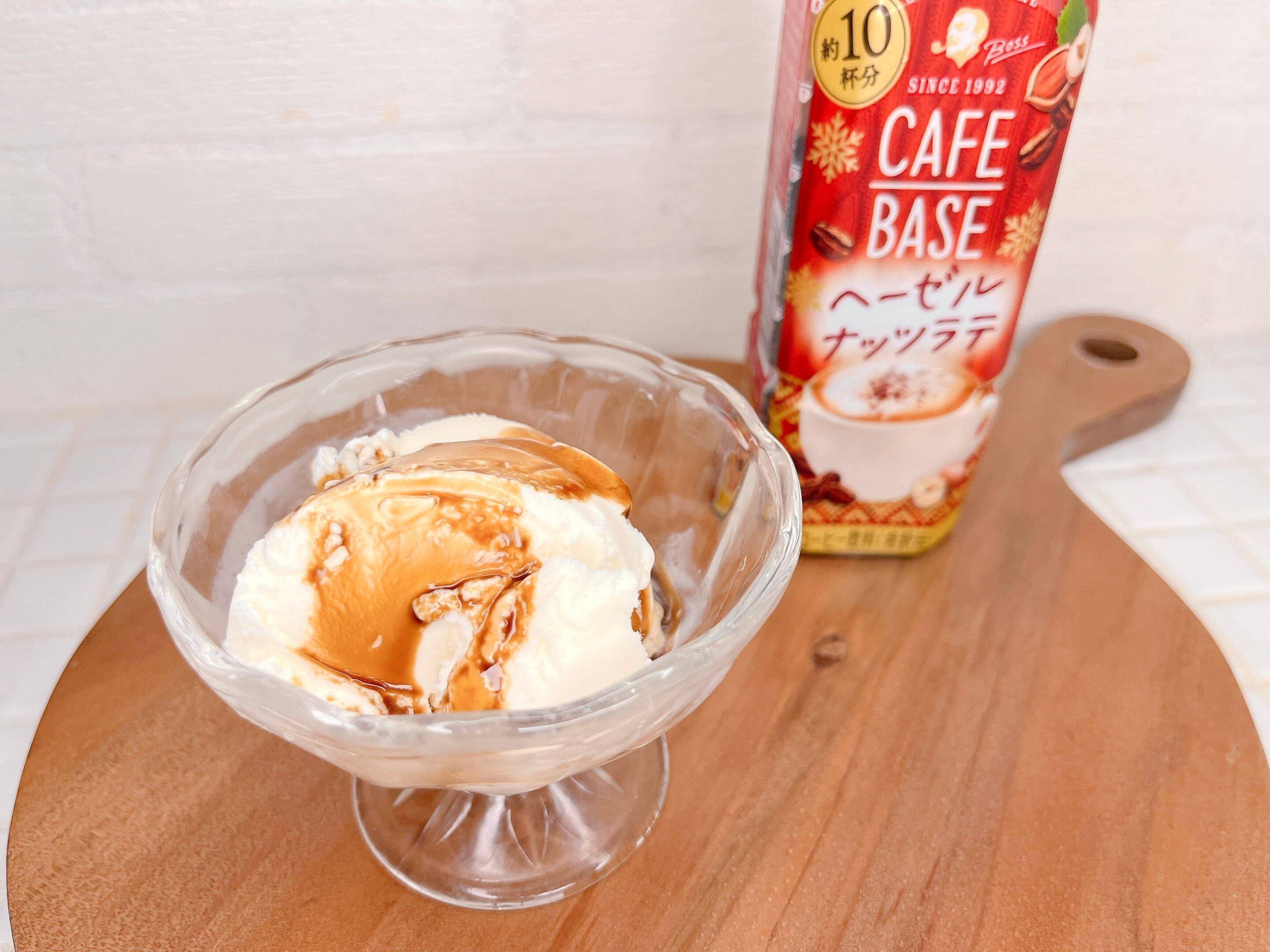 アイスの上にストックしてあるカフェベースのヘーゼルナッツラテをかけましたが、極上のヘーゼルナッツミルクアイスの出来上がり!濃厚なミルクアイスとヘーゼルナッツラテの相性抜群で、ワンランク上の味が楽しめてとってもおすすめです。
