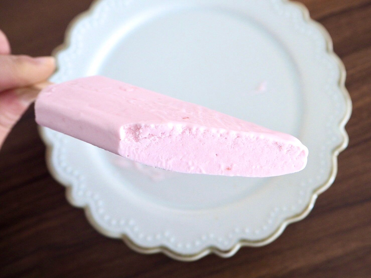 断面からは分かりづらいですが、アイスの中に苺の果肉が入っておりフレッシュな甘酸っぱさを感じることができます。