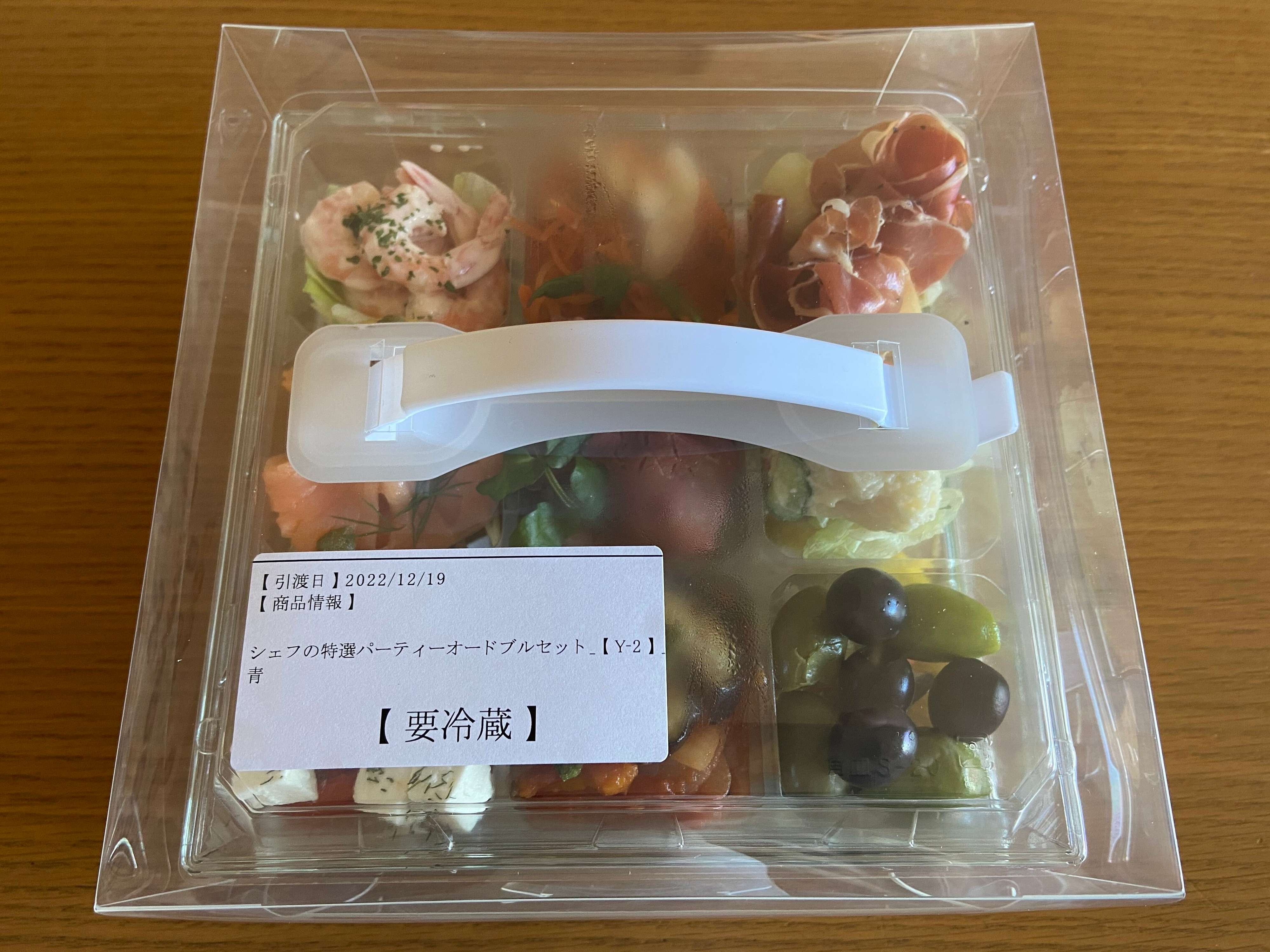 オードブルはプラスチックのケースに持ち手がついて運びやすいようになっています。店頭で受け取った際はこのケースが保冷バッグに入っていて保冷材も入れてくれました。