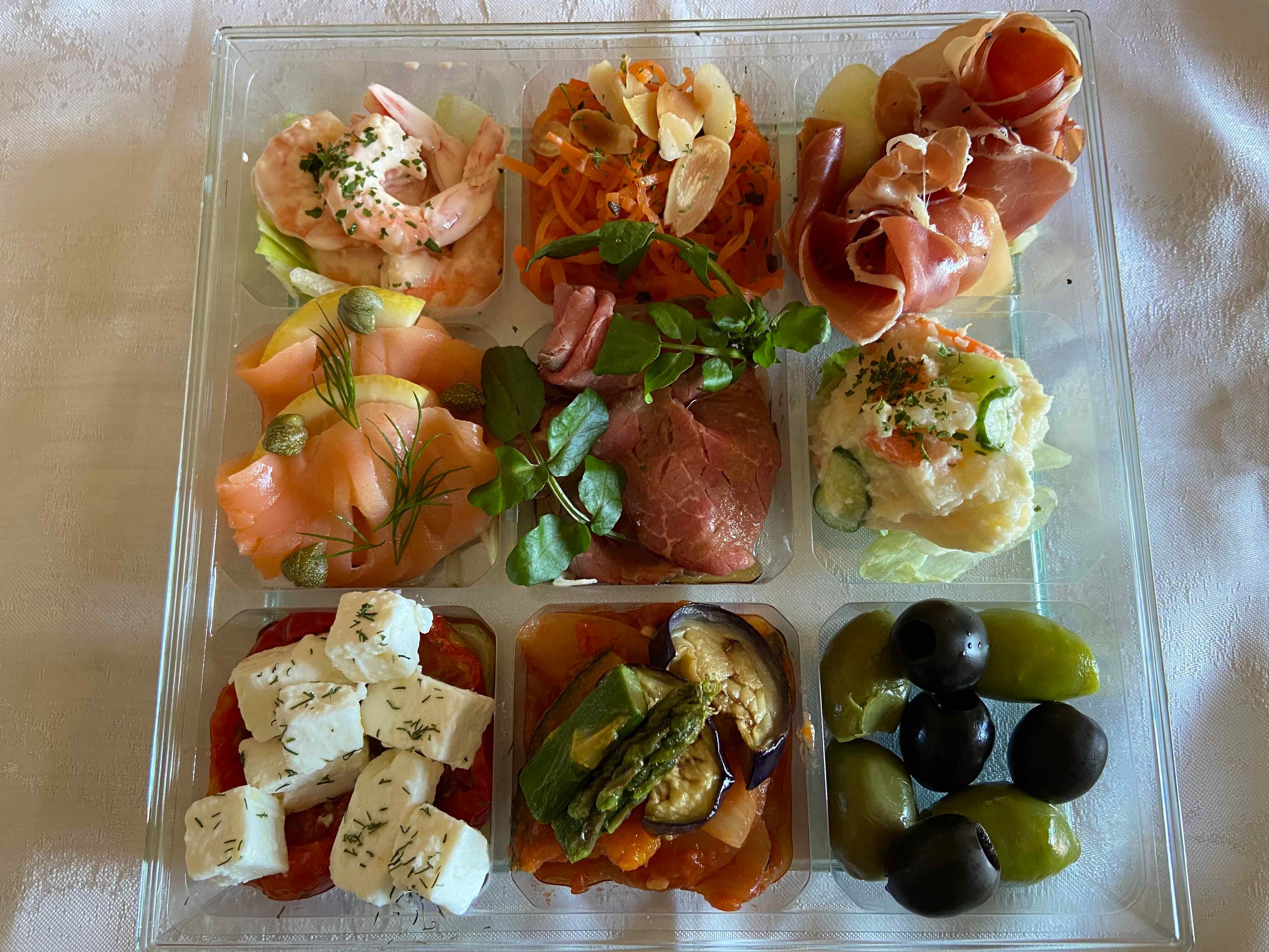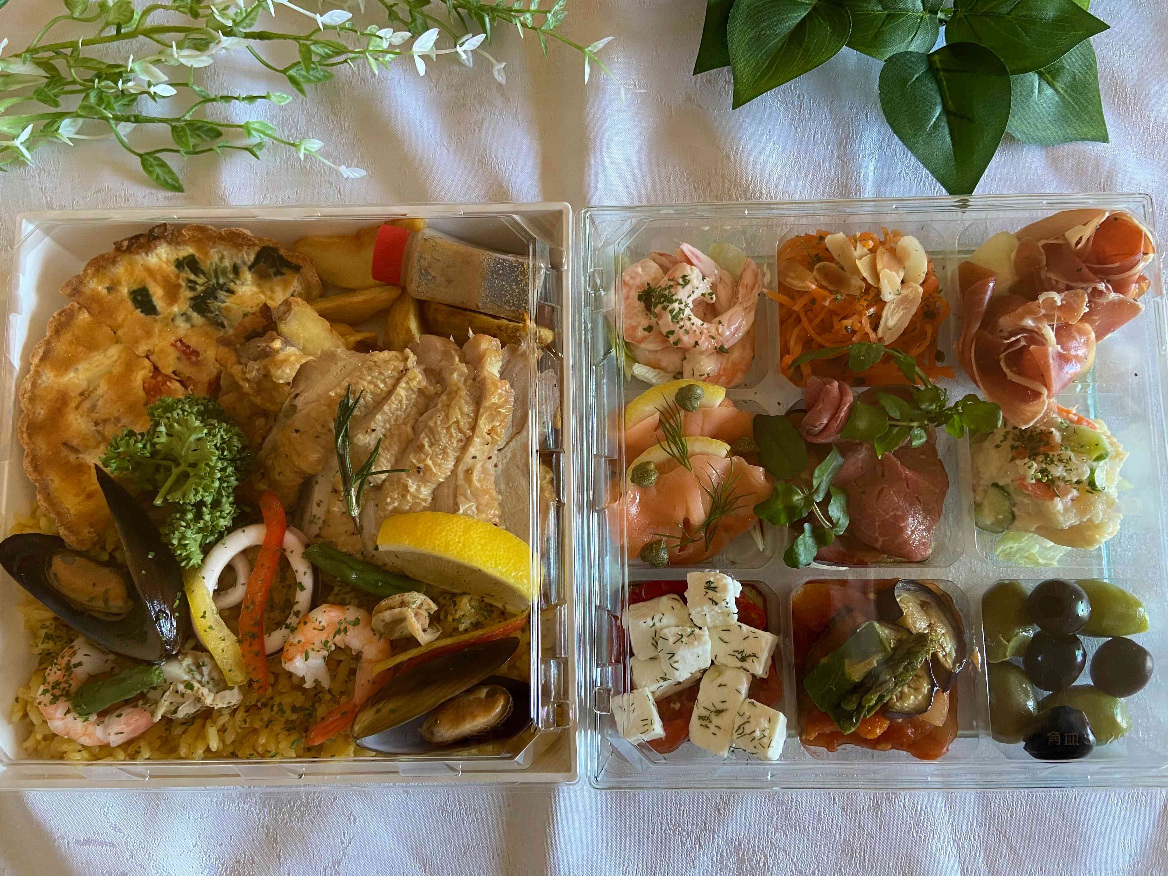 2段になっていてそれぞれフタを取ると、とっても華やかでおいしそうなオードブルが!