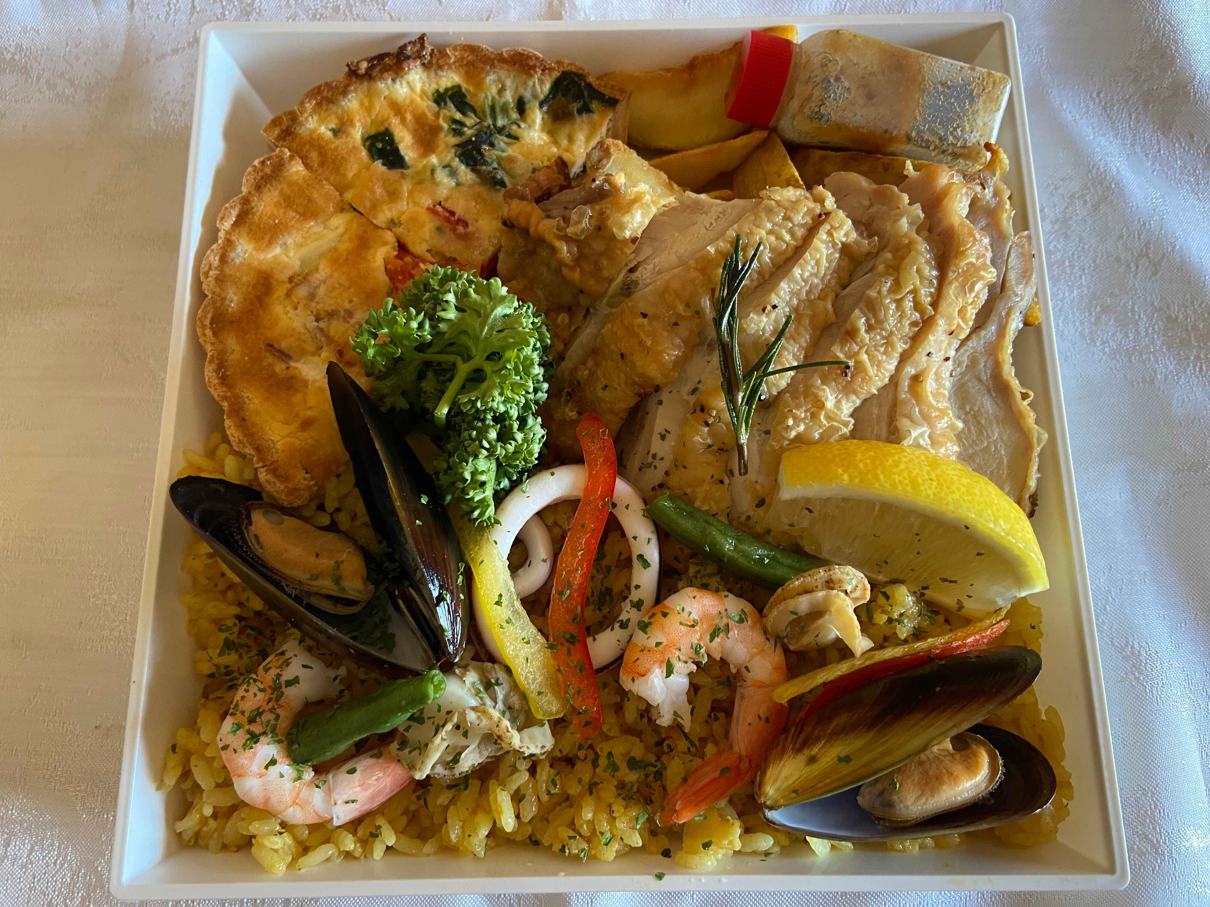 海鮮がごろごろとのった見た目も豪華なパエリアは米一粒一粒に魚介の旨みが染みて味わい深く、バルサミコソースをかけて食べるチキンも柔らかくジューシー。