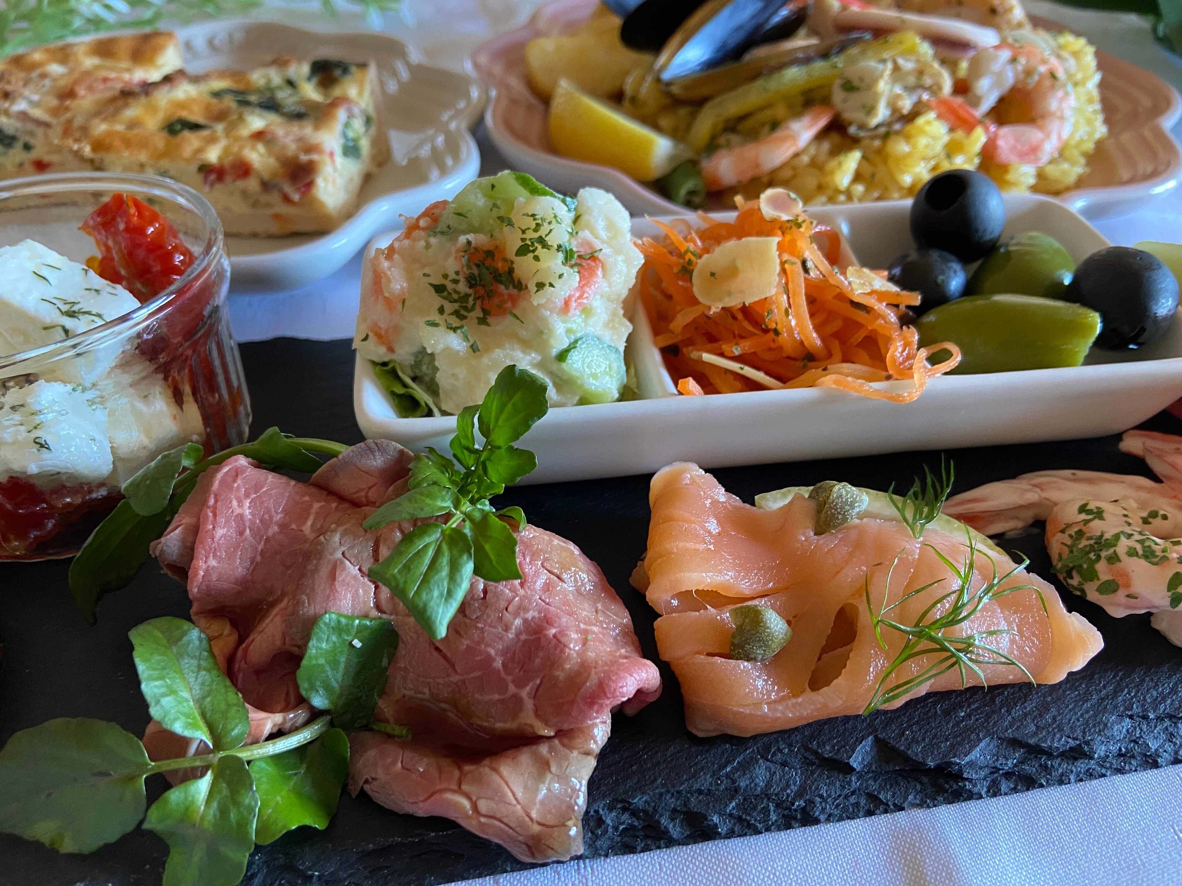 ローストビーフはしっとり柔らかく旨みが濃くて絶品、売り上げ1位のスモークサーモンも肉厚でおいしいです。ワインのおともにもぴったりのオリーブやフェタチーズ、酸味がキュッと効いたキャロットラペはさっぱりとしていいですね。