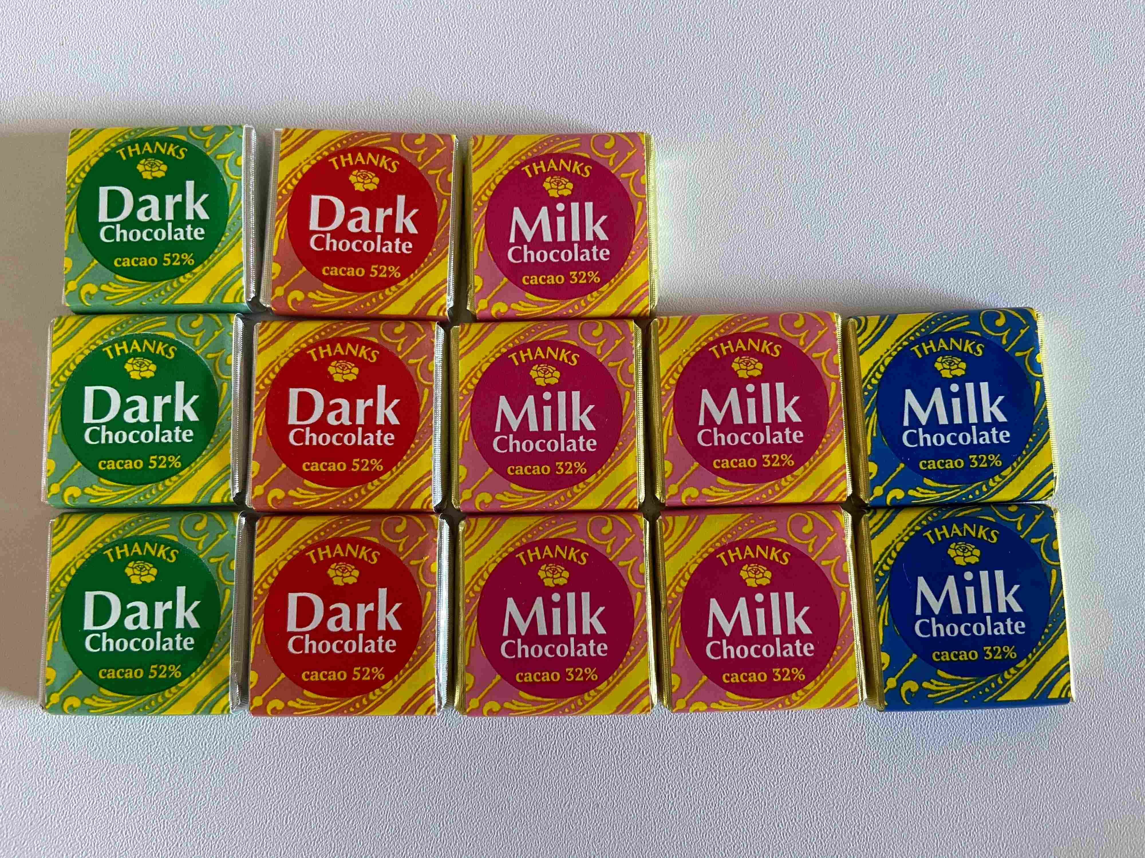 カラーは4種類ありますが、味はカカオ52%のダークチョコレートと、カカオ32%のミルクチョコレートの2種類。