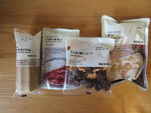 おなじみの不揃いバウムシリーズ、ビスケットやポップコーンなどのお菓子、レトルトカレーなどの食品が無印良品コーナーの一番手前にありました。