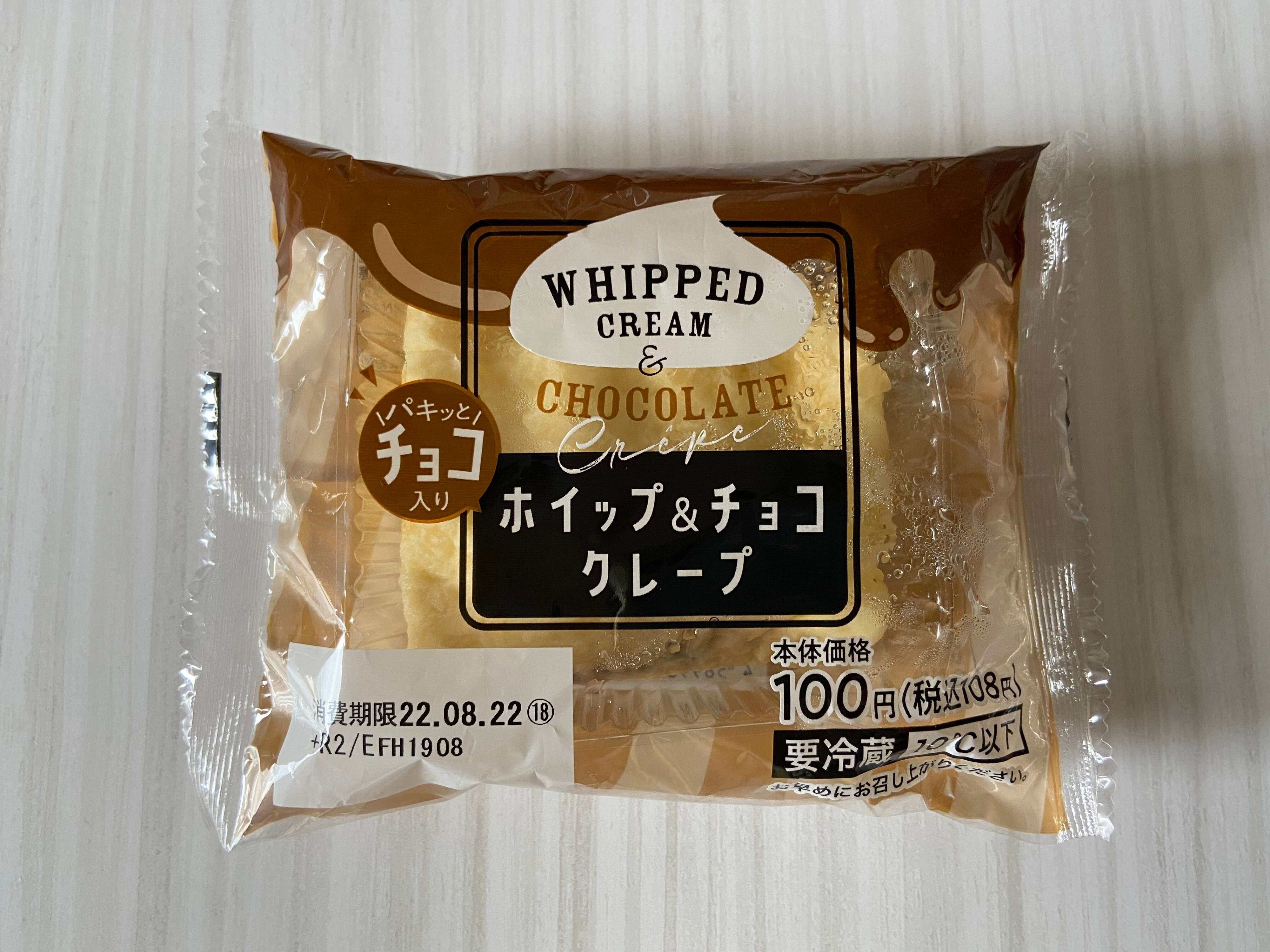 ローソンストア100のスイーツコーナーで見つけた「ホイップ&チョコクレープ」(購入時:108円)。