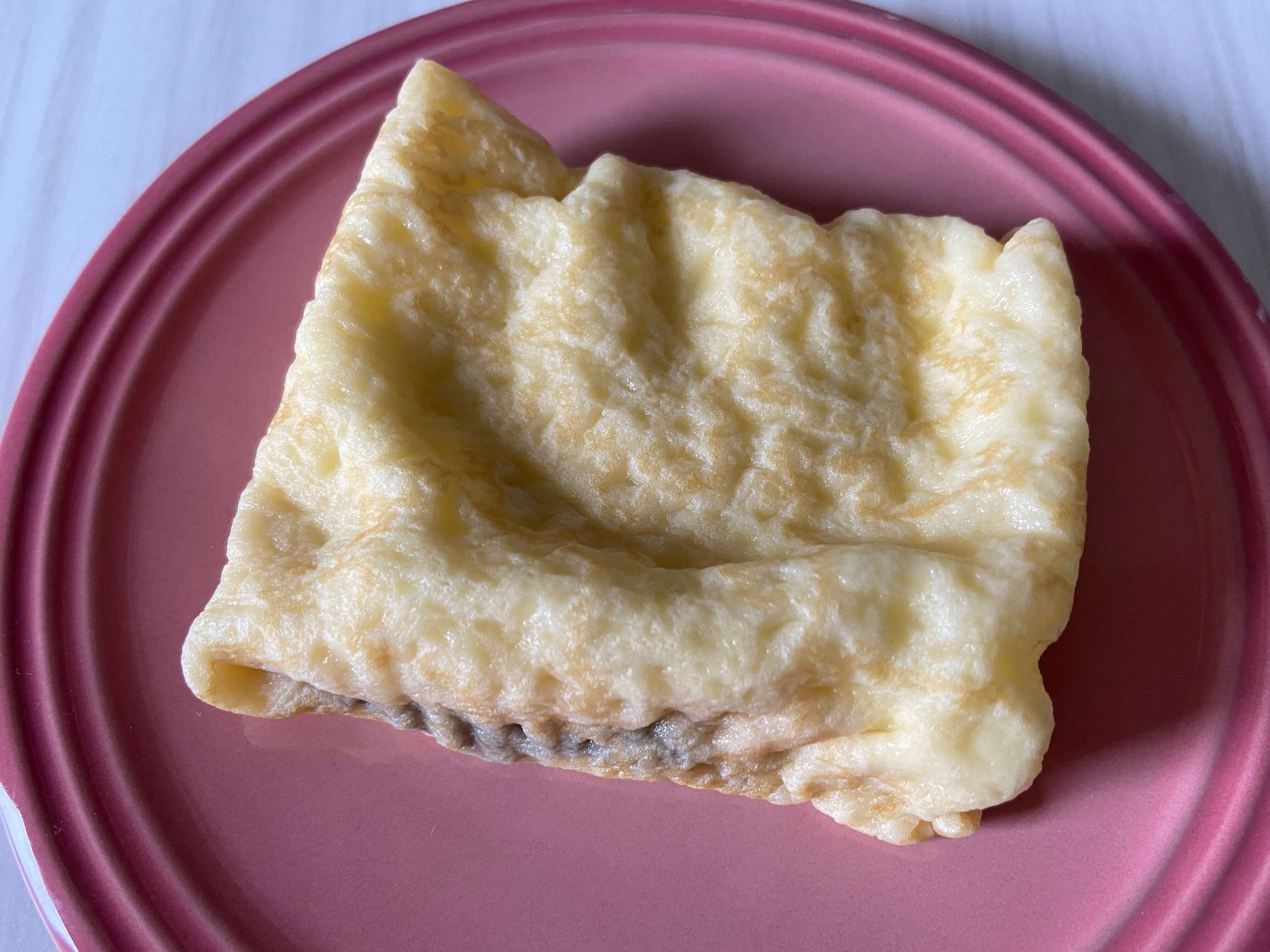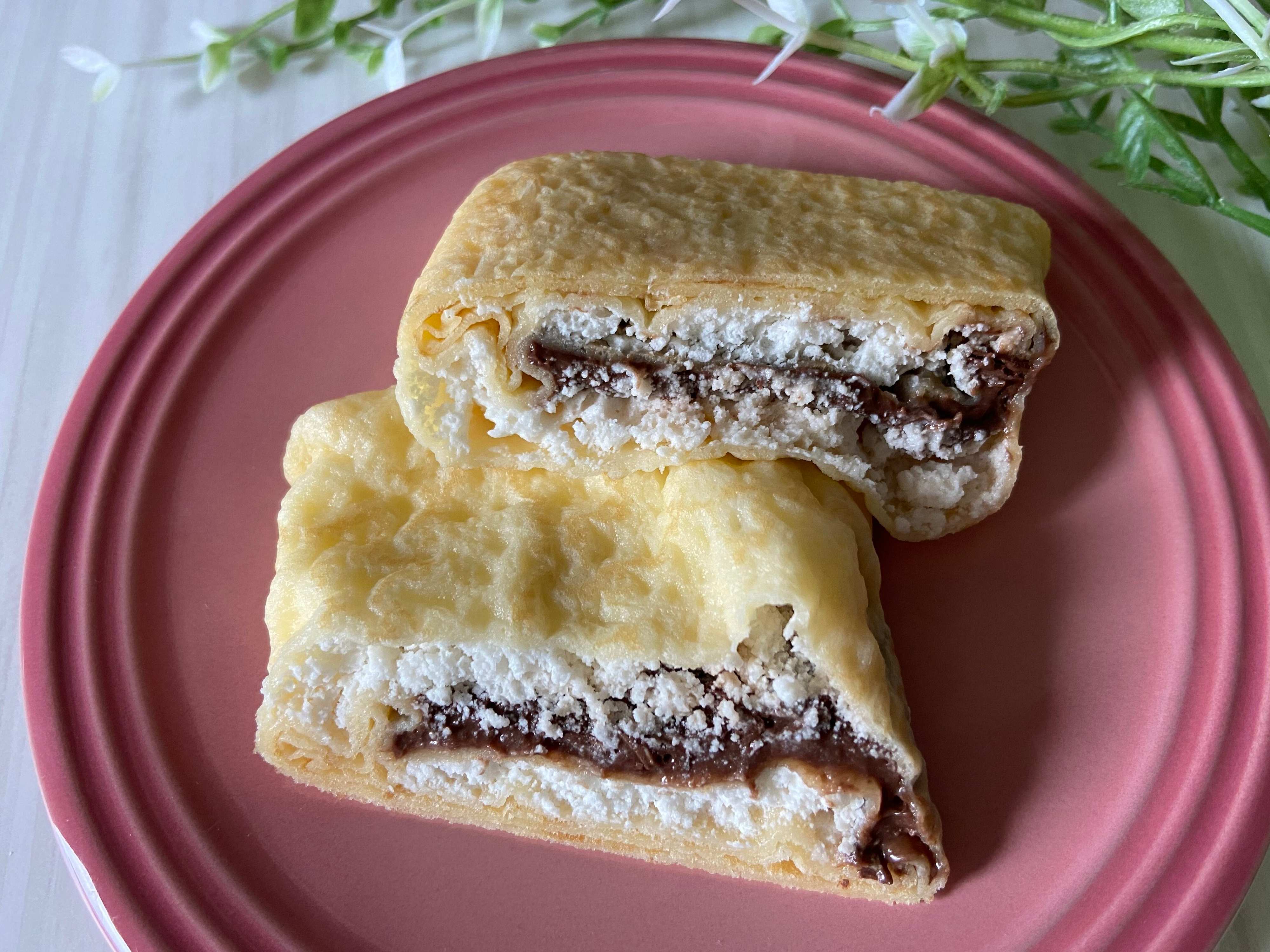 チョコクリームは端までたっぷり入っていて、ところどころにある小さな板チョコのようなパキッとチョコがビターテイストで食感も味もアクセントに。クレープ生地は薄いながらにももっちりとした食感です。全体的に甘すぎない味わいでボリュームたっぷりでも重くないのがうれしいポイント。
