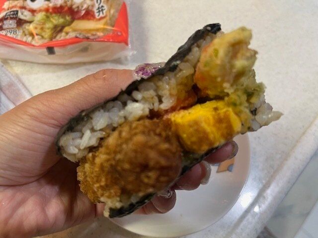 おにぎりというより、ごはんの間におかずがサンドされている感じで、