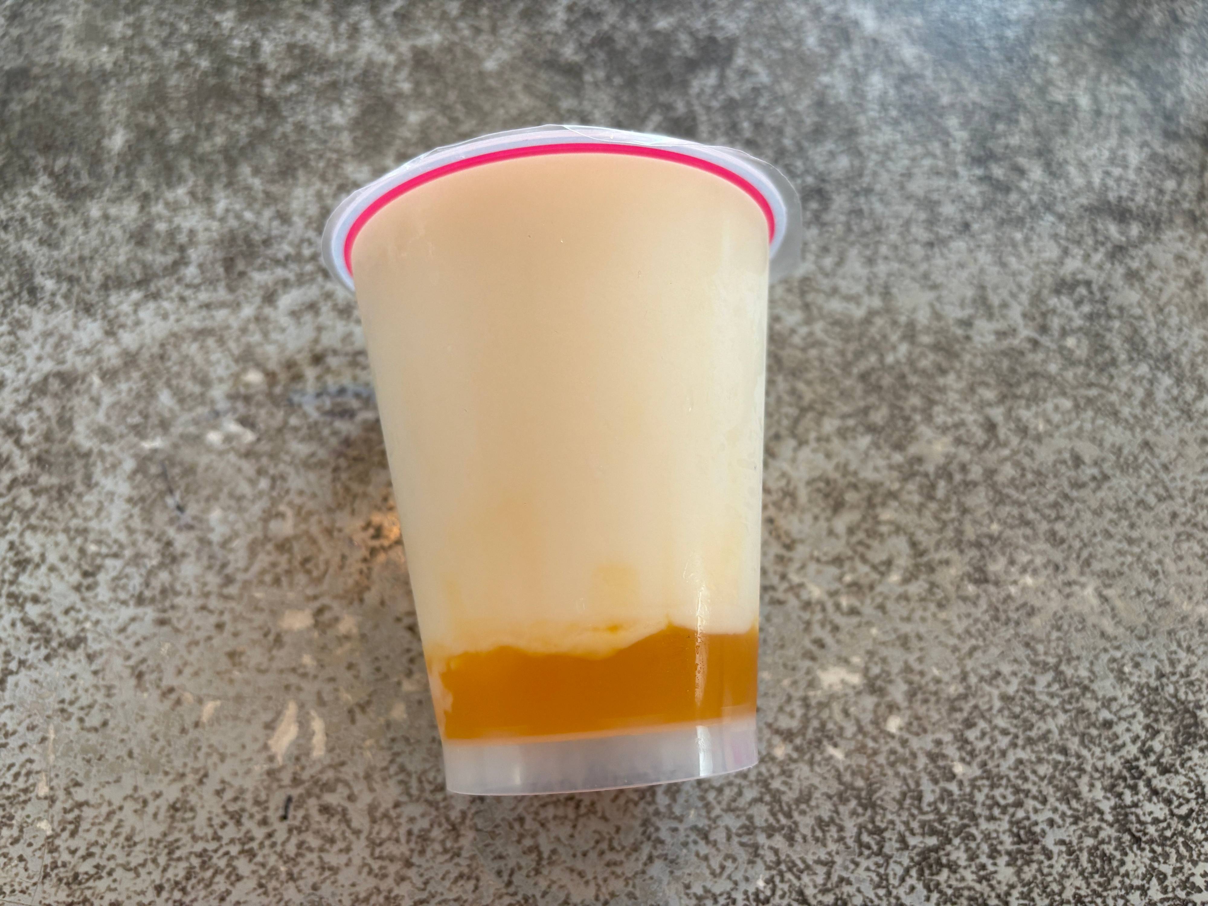 カップの底には、マンゴーソースがたっぷり。こちらのマンゴーソースはマンゴーそのもののような濃厚な味わいで杏仁豆腐にとてもよく合うんです。ソースといってもゼリー状なので、杏仁豆腐と一緒にツルッと食べられますよ。