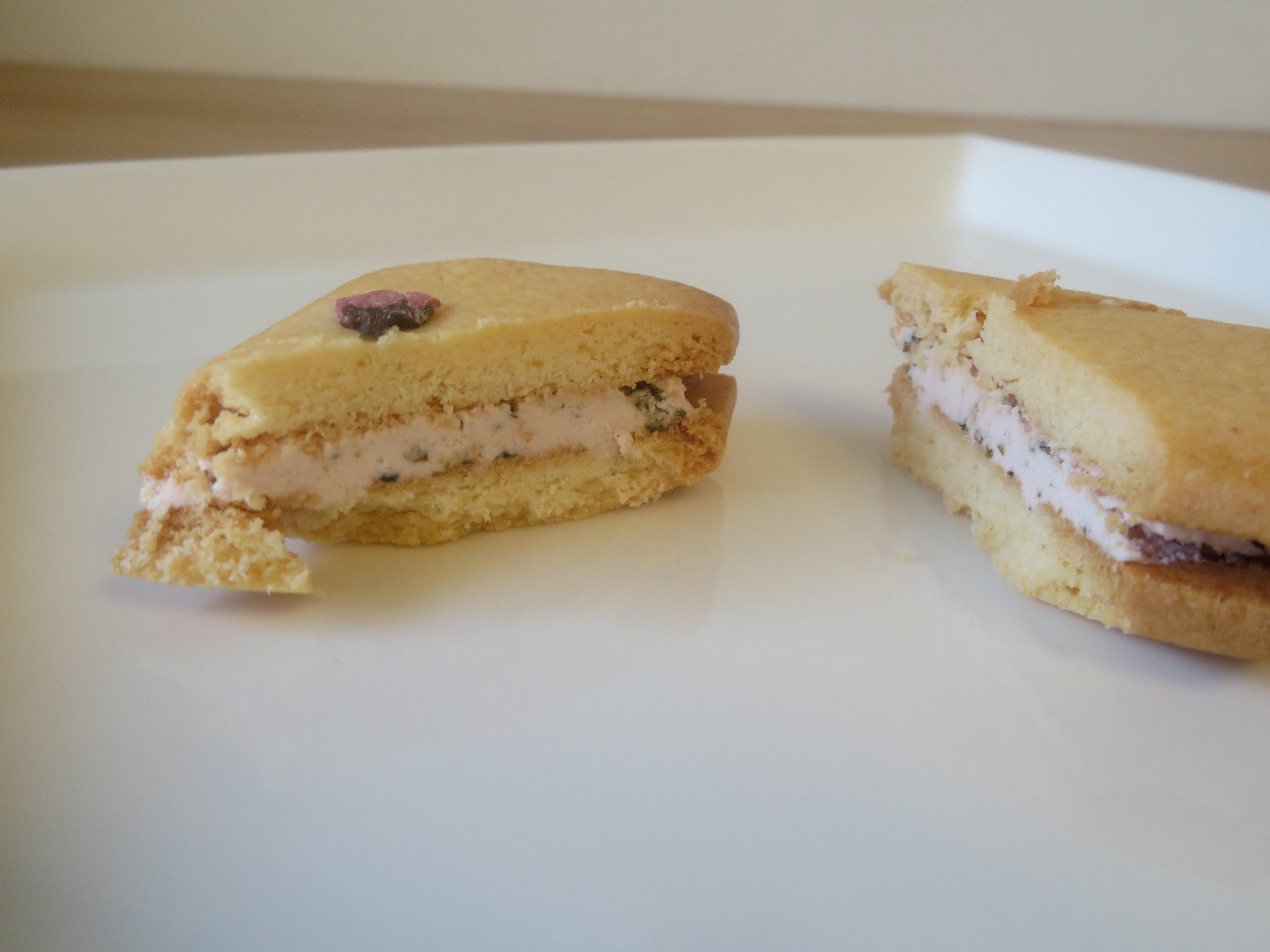 表面に桜の塩漬けがのった、可愛らしいクリーム入りクッキー。