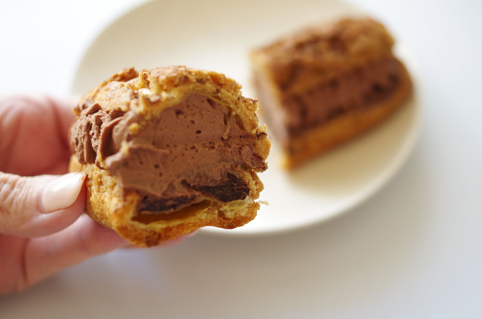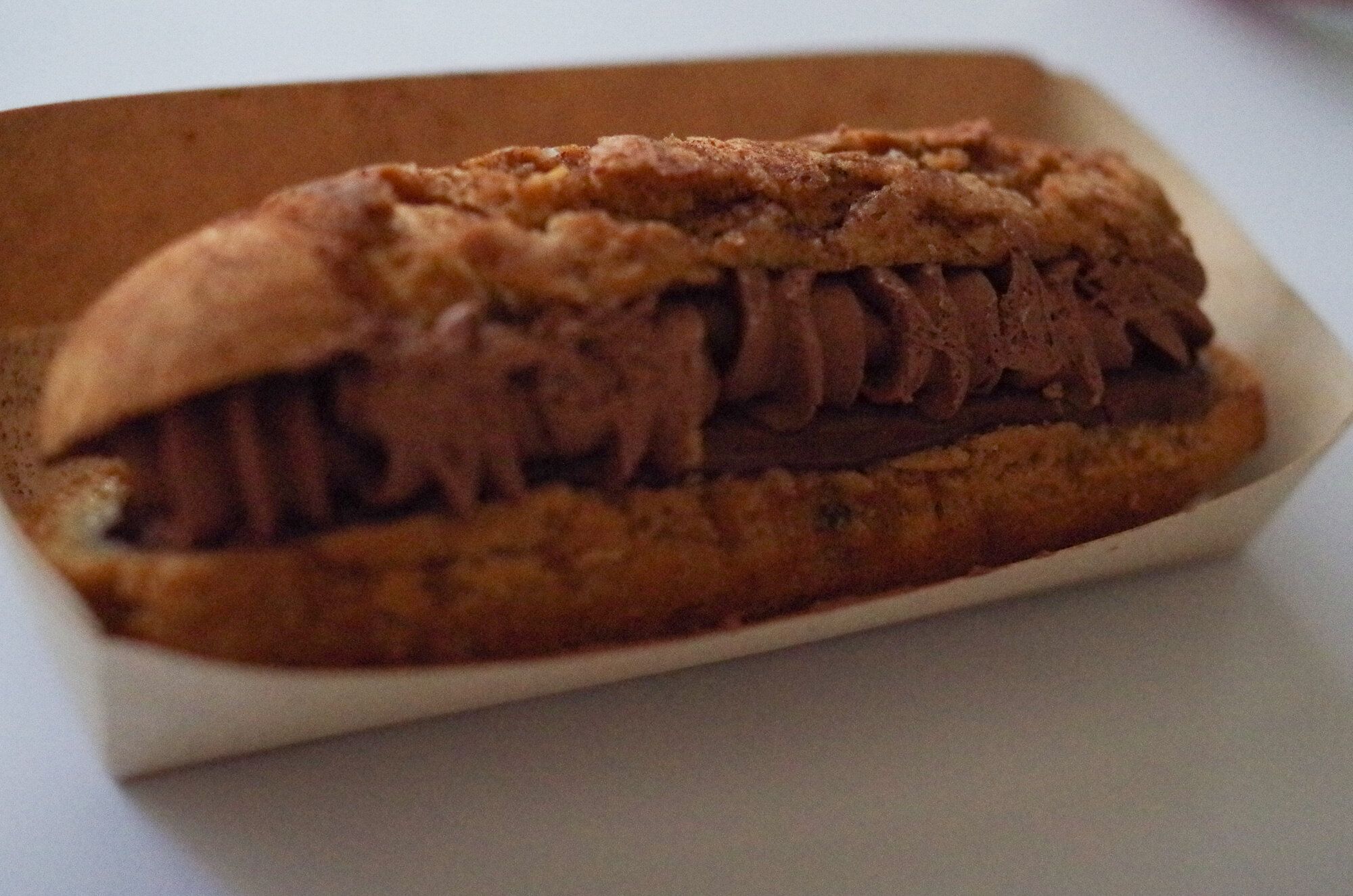 通常のセブンイレブンのエクレアのパッケージよりもひとまわり大きなサイズ感と、紙のパッケージで特別感があります。これは期待度高まっちゃいますよね。エクレアのシュー部分にはクッキー生地のザクザク感を味わえます。結構上にかかってるココアパウダーで開けた瞬間、手に付いたり汚れる可能性もあるので、開封の際は慎重に。気を付けてください。