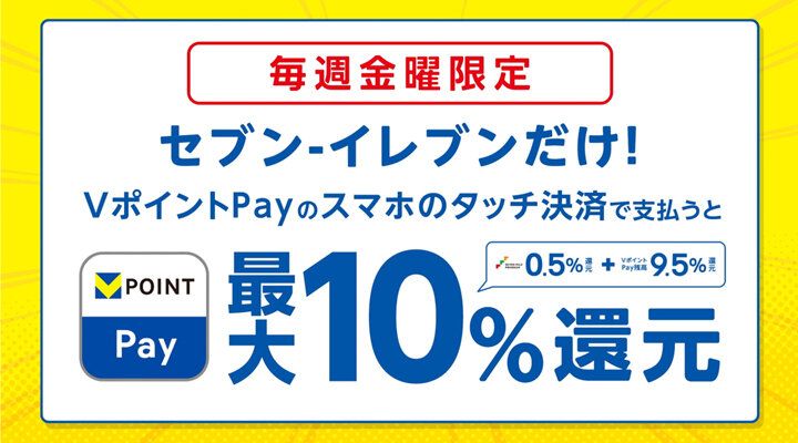 毎週金曜日はVポイントPayアプリでのスマホのタッチ決済で最大10%還元。これはセブン-イレブン限定のサービス。利用しない手はないですよね。まずはVポイントPayアプリをダウンロードしてください。利用方法はこちらもカンタン!