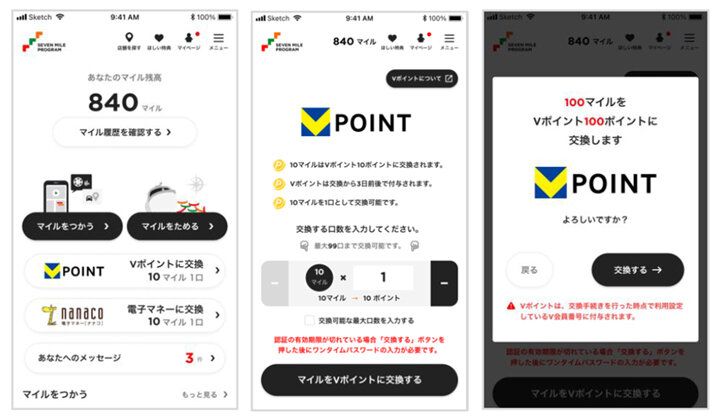 設定は簡単! セブン-イレブンアプリの「マイル残高」から「最新マイル確認・交換」を選び「Vポイントに交換」をタップします。1日当たりに交換できるマイル数には上限がありますが、これでポイント活用法もぐ〜んと広がります。