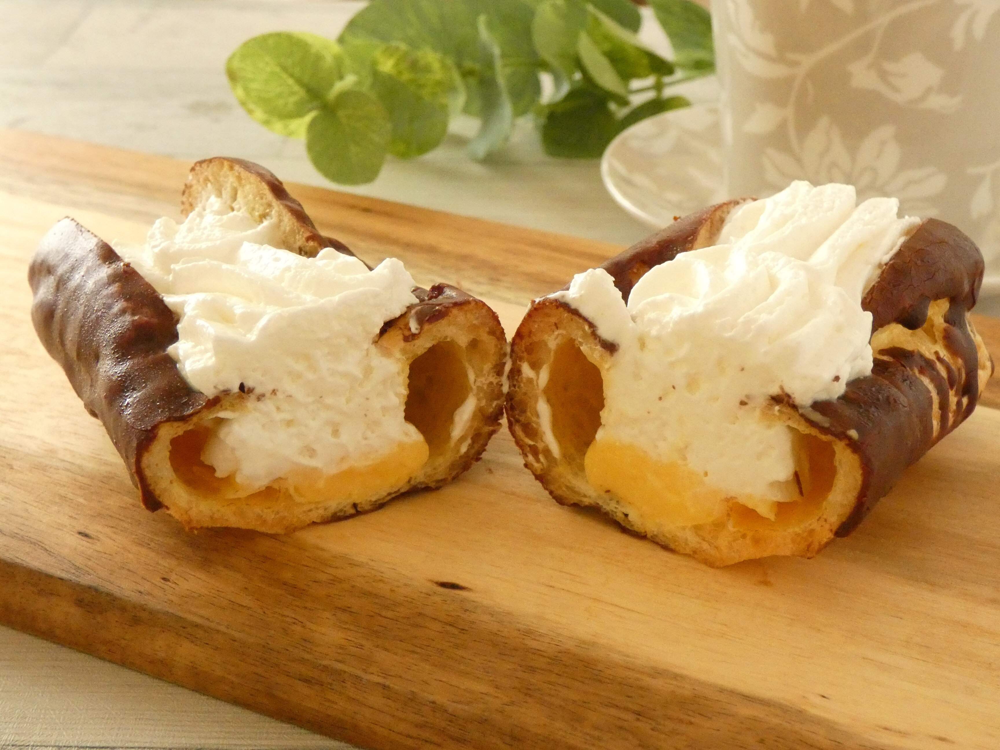 エクレアにはたっぷりのホイップクリームが絞ってあり、ホイップクリームの下にはカスタードクリームが入っています。