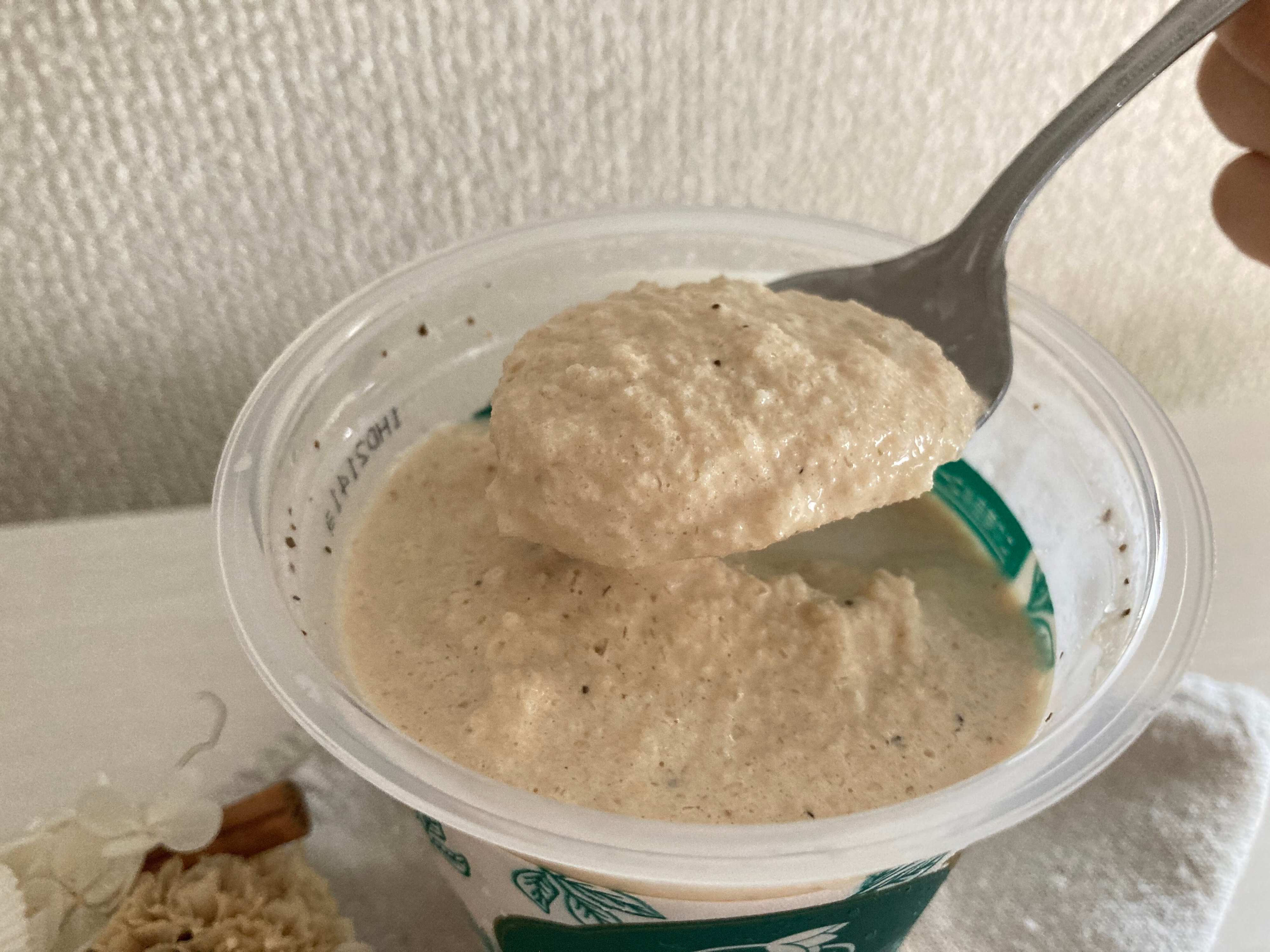 口に入れた瞬間、紅茶の良い香りが感じられます。氷のシャリシャリ感とミルクティーが混ざり合わさり滑らかな喉ごしで、その中に紅茶風味のクッキーが良いアクセントになっており、とっても美味しくて感激しました。