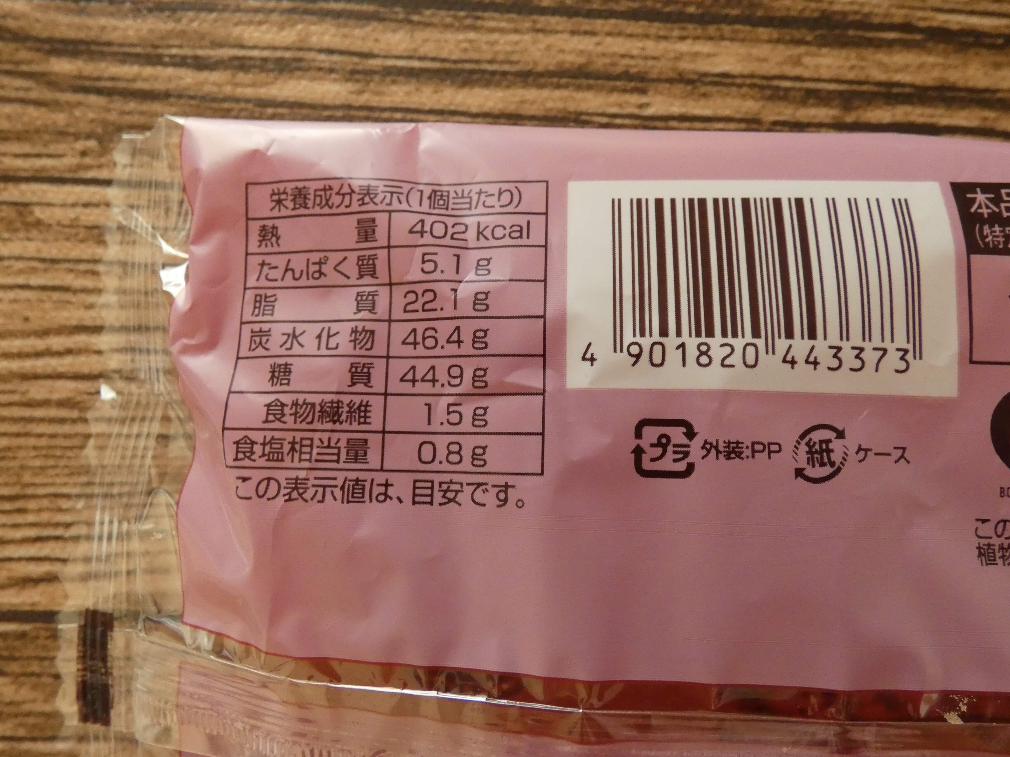 栄養成分表示を見ると、1個のエネルギーは402kcal。カロリー高めのスイーツパンです。