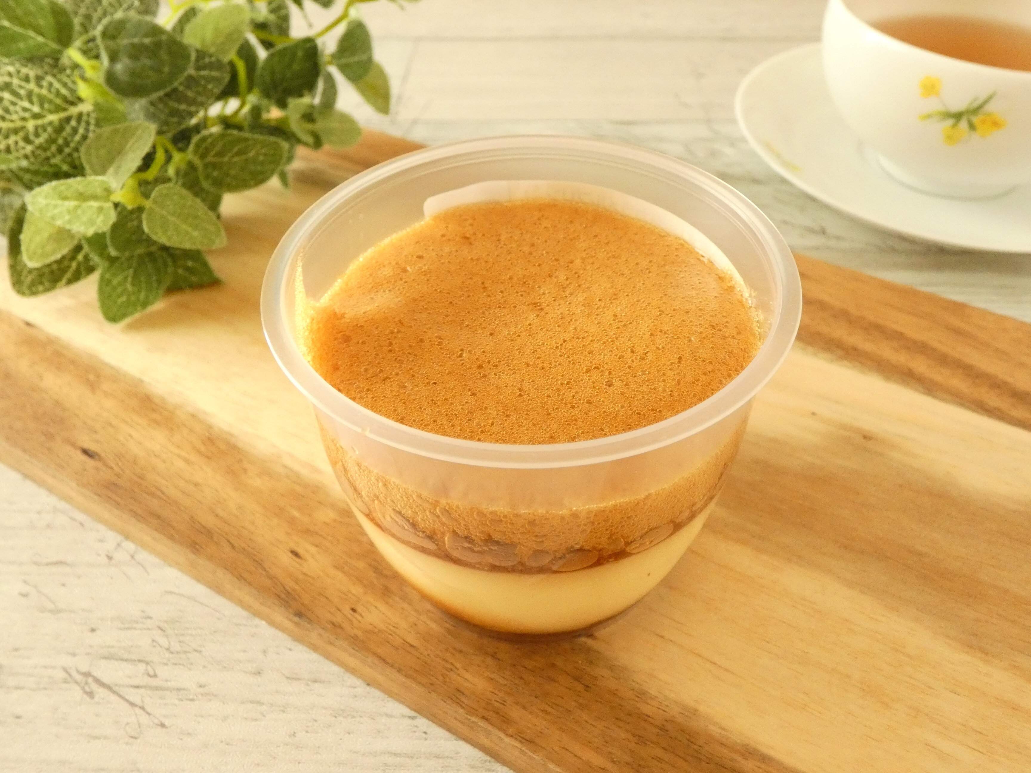 フタを取ると、きめ細かい泡のカラメルがたっぷり乗っています。下にはなめらかプリンがあり、一番下にはカラメルソースが入っています。