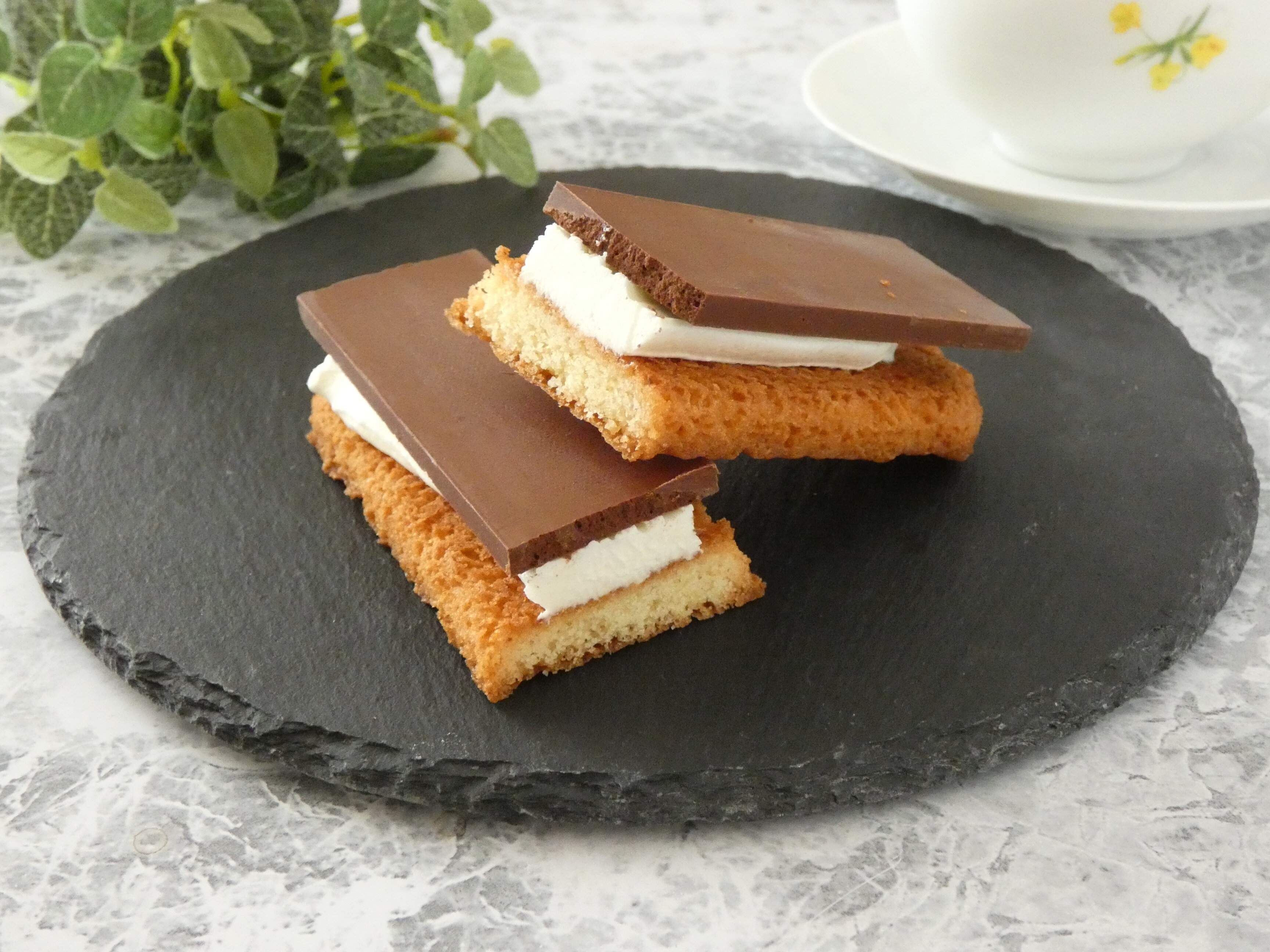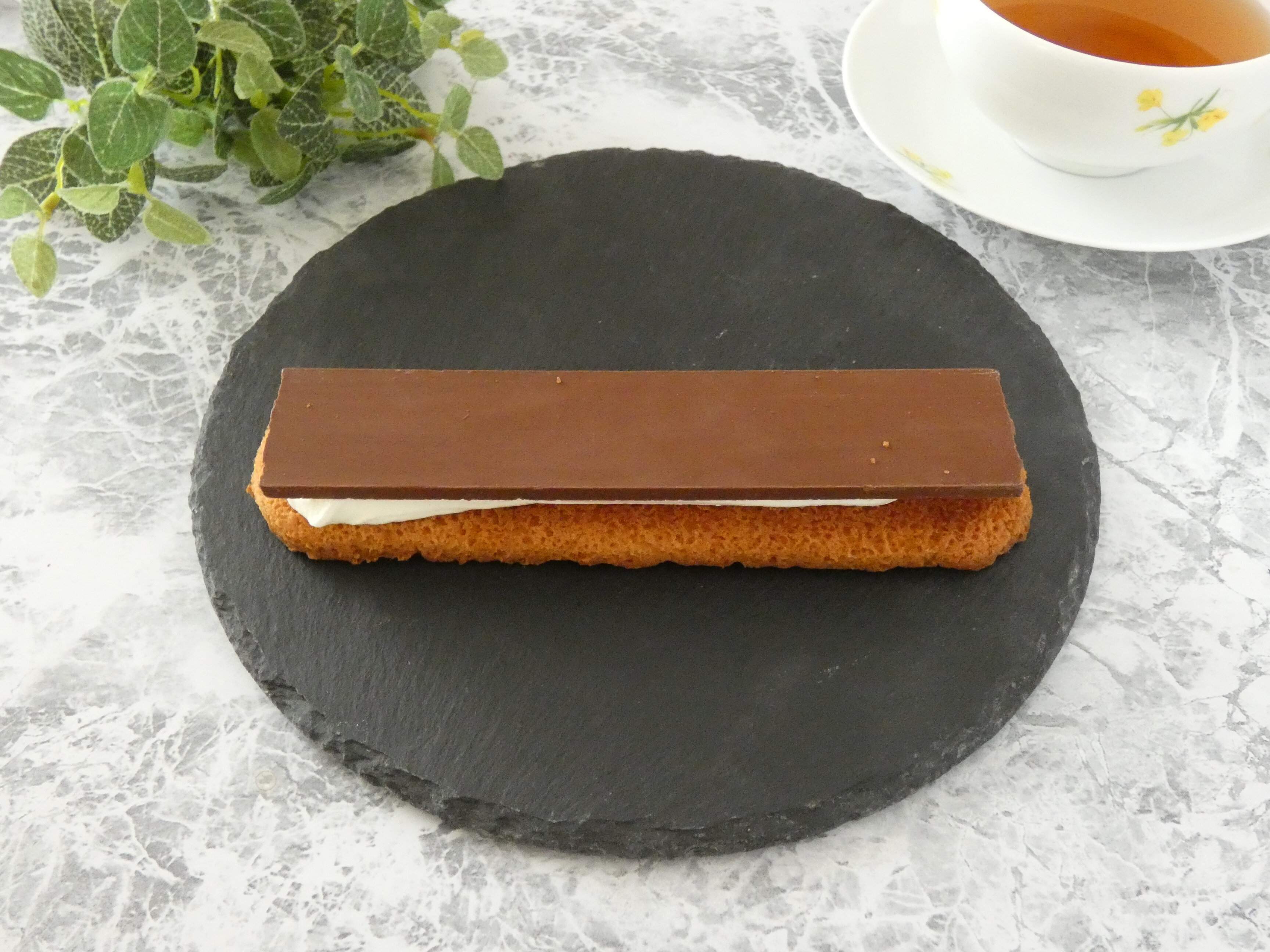 細長い形のクッキー生地にエアインチョコレートがど~んと乗っていて、間にはミルク風味のクリームがたっぷり挟まっています。