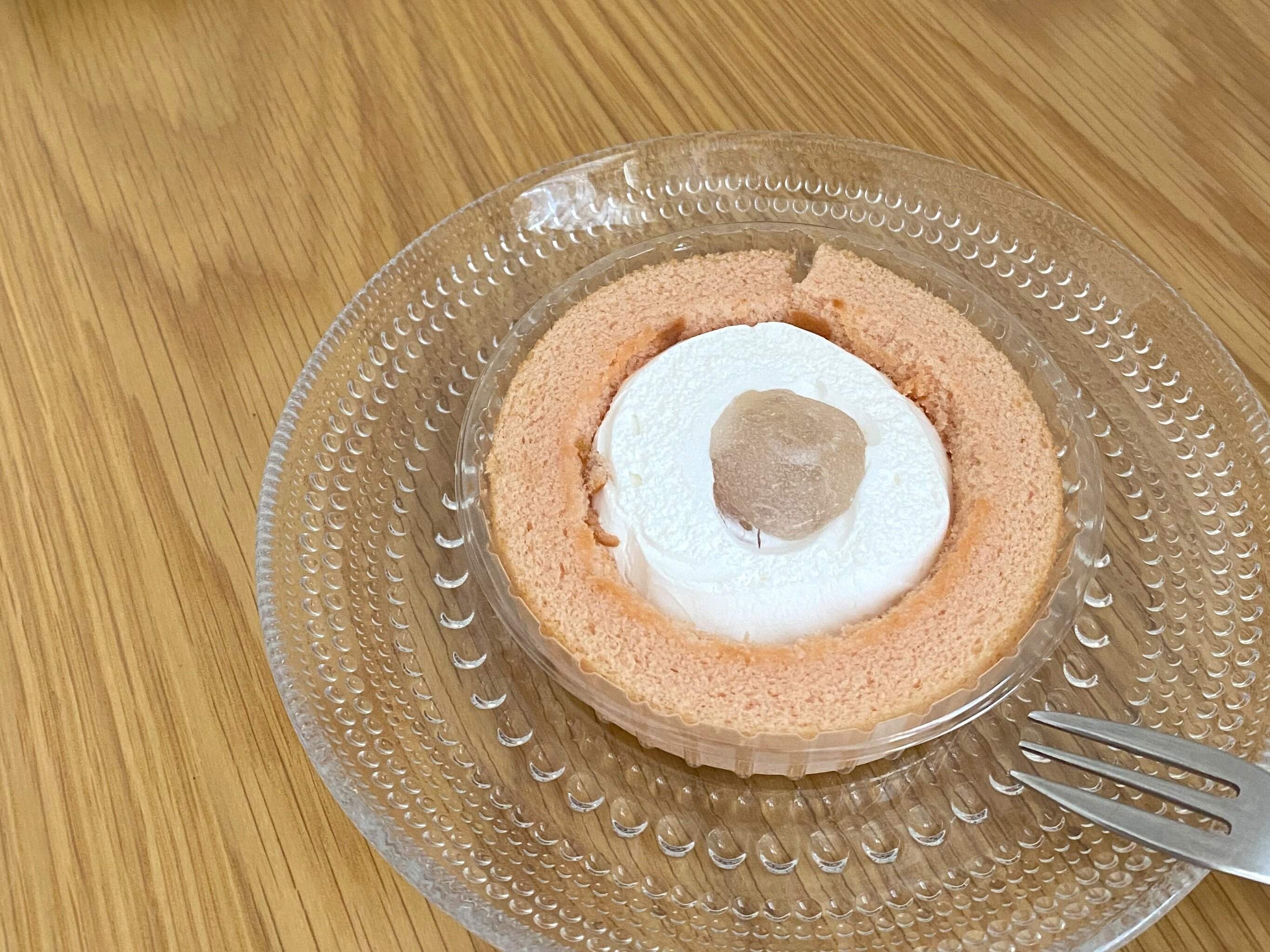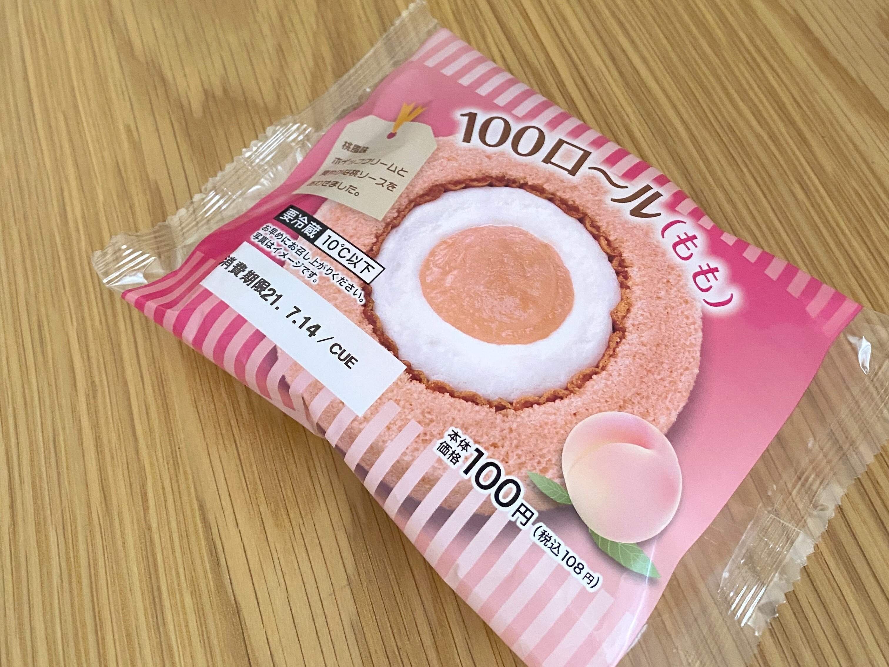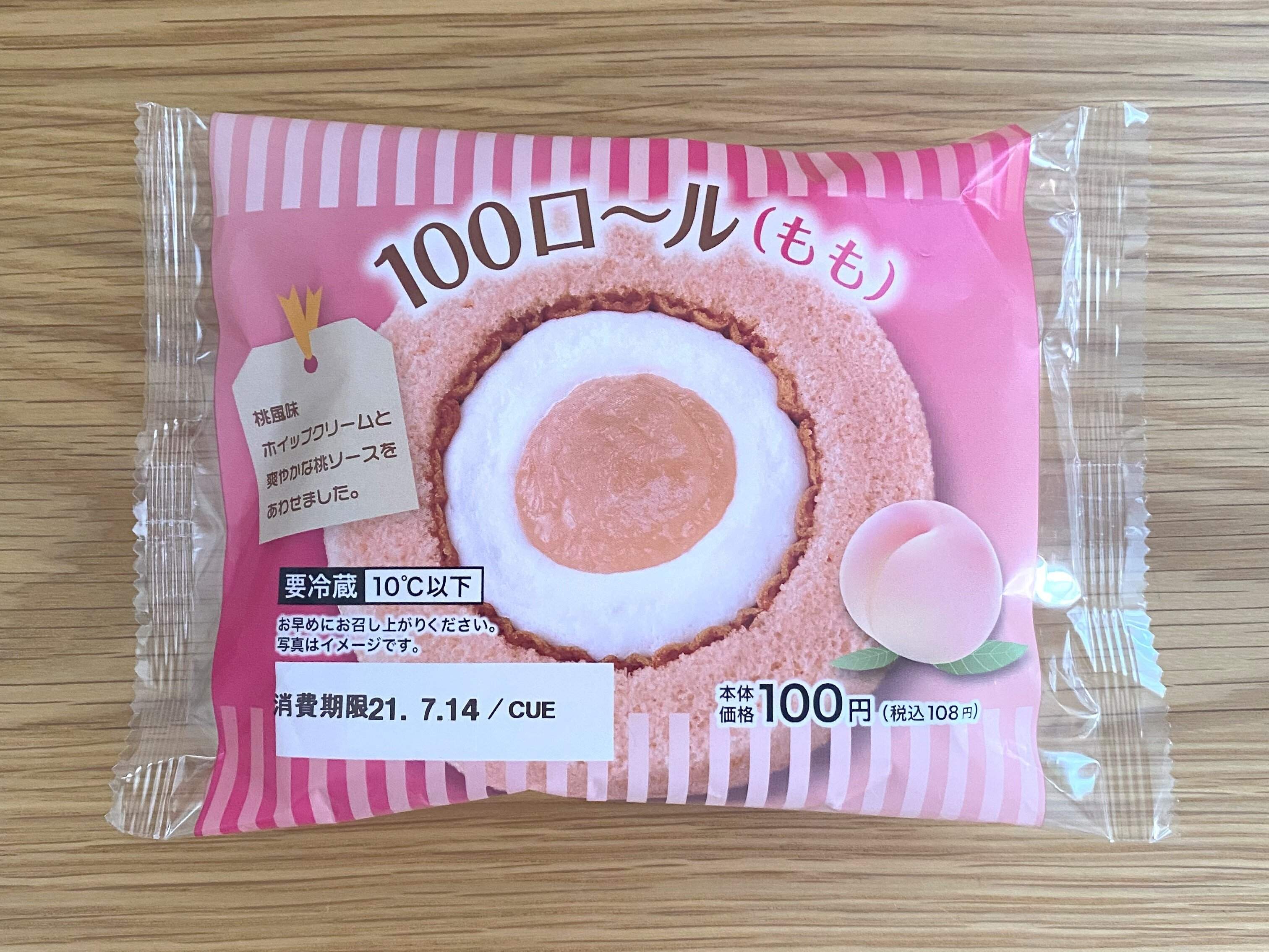 ローソンストア100の商品情報には、「ピンク色の生地に桃風味のホイップを絞り、中央には白桃の果肉が入ったソースをトッピングしました。旬のおいしさを味わえるロールケーキです。」と紹介されていました。