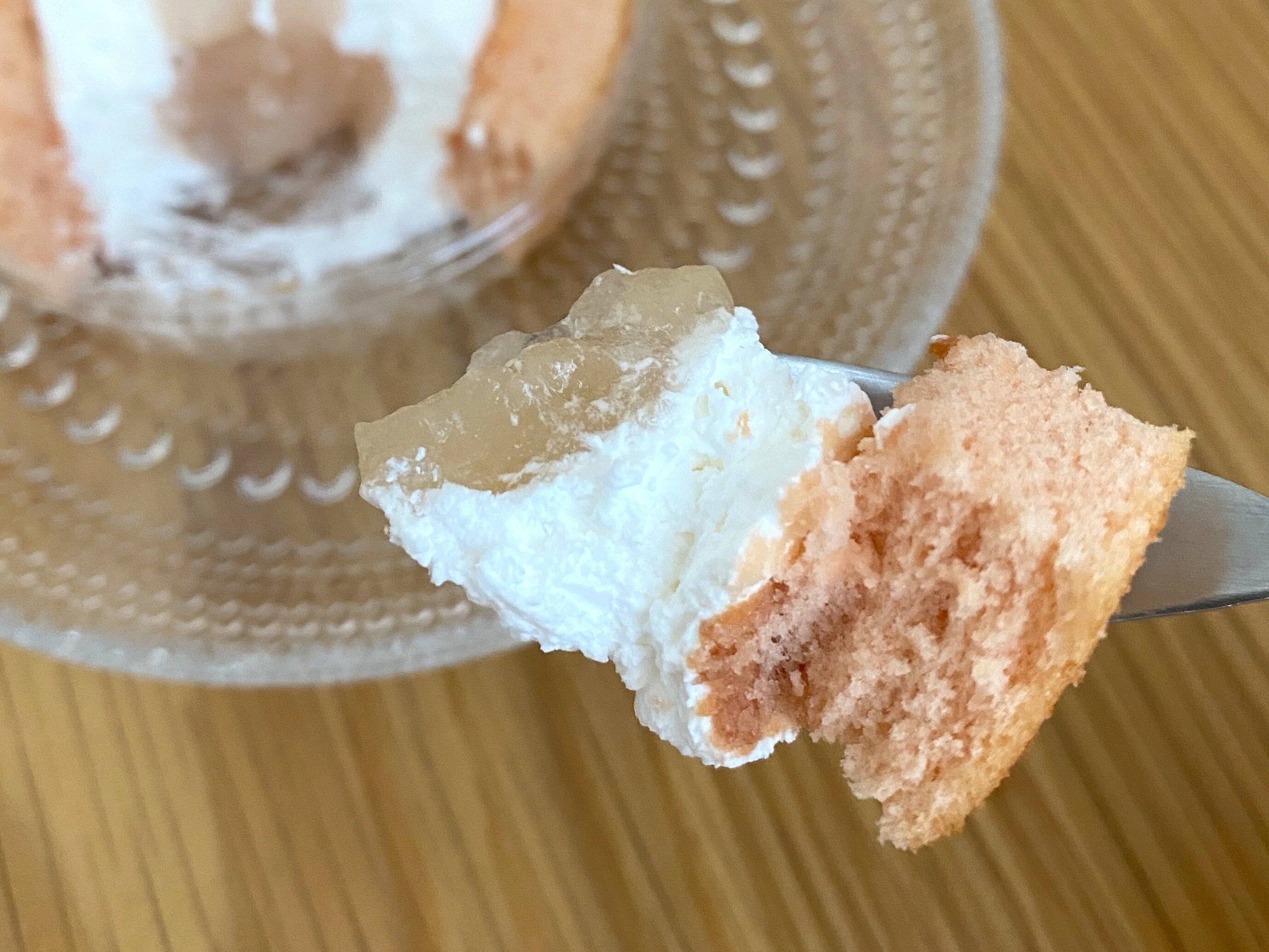 中央の桃果肉入りソースは果肉感がしっかりとあり味も濃い!桃風味のホイップと混ざり合うと桃の風味がさらにアップしミルキーさもプラスされます。ふわふわの生地は甘さ控えめなので、ソースとホイップとの味のバランスがいいです◎