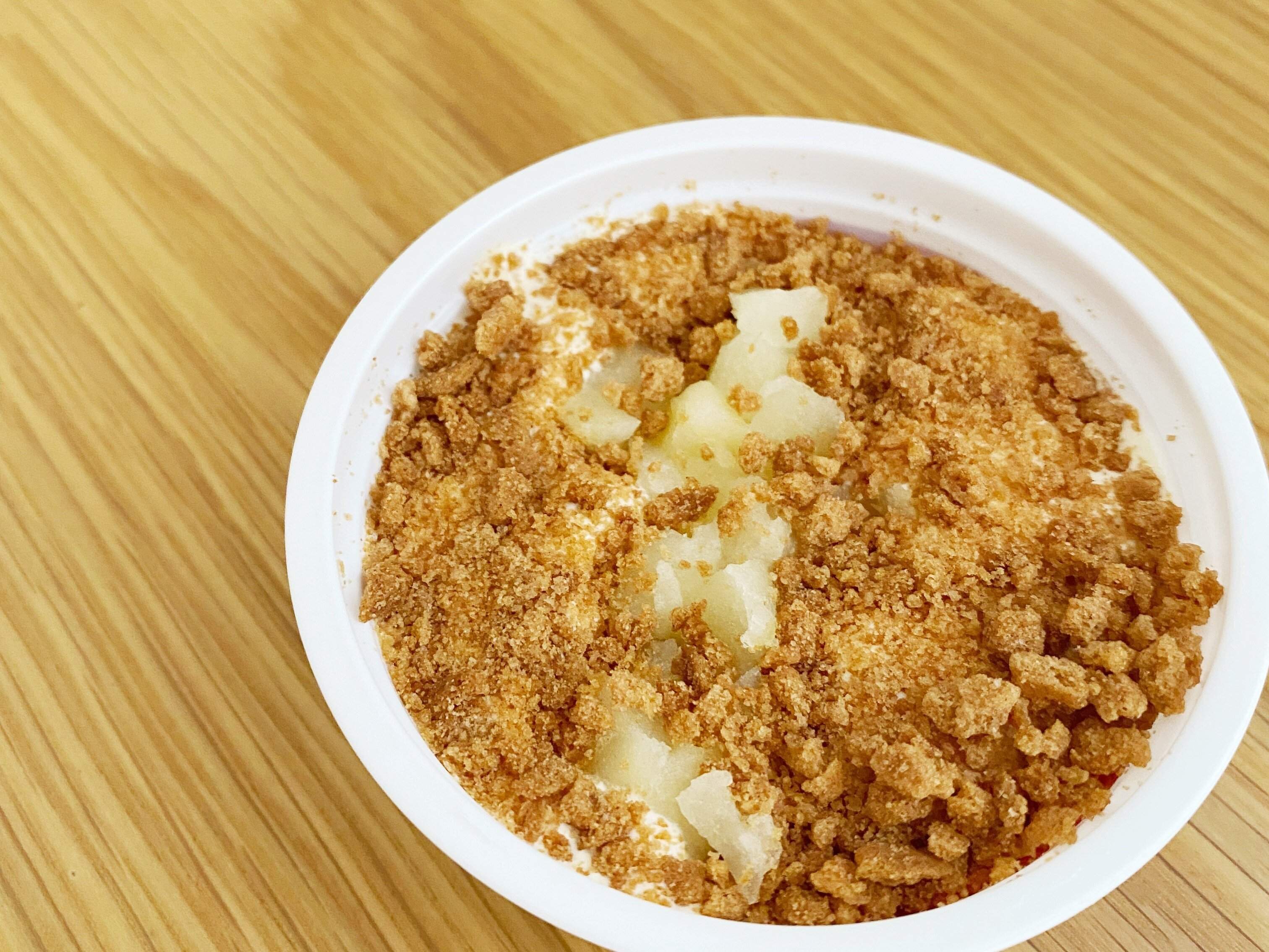 ビターカラメルソースが入ったカスタード風味アイスに、シナモンクッキーとシロップ漬けりんごがトッピングされています。