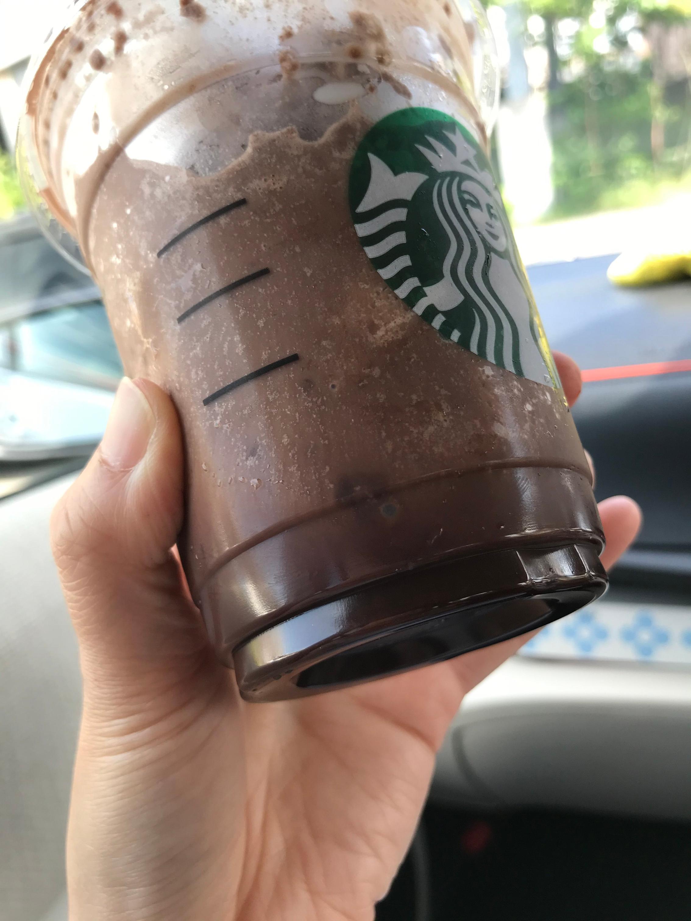 スポンジケーキにアールグレイティーとチョコレートを合わせたフラペチーノとのこと。底の一番濃いところがスポンジケーキでしょうか?