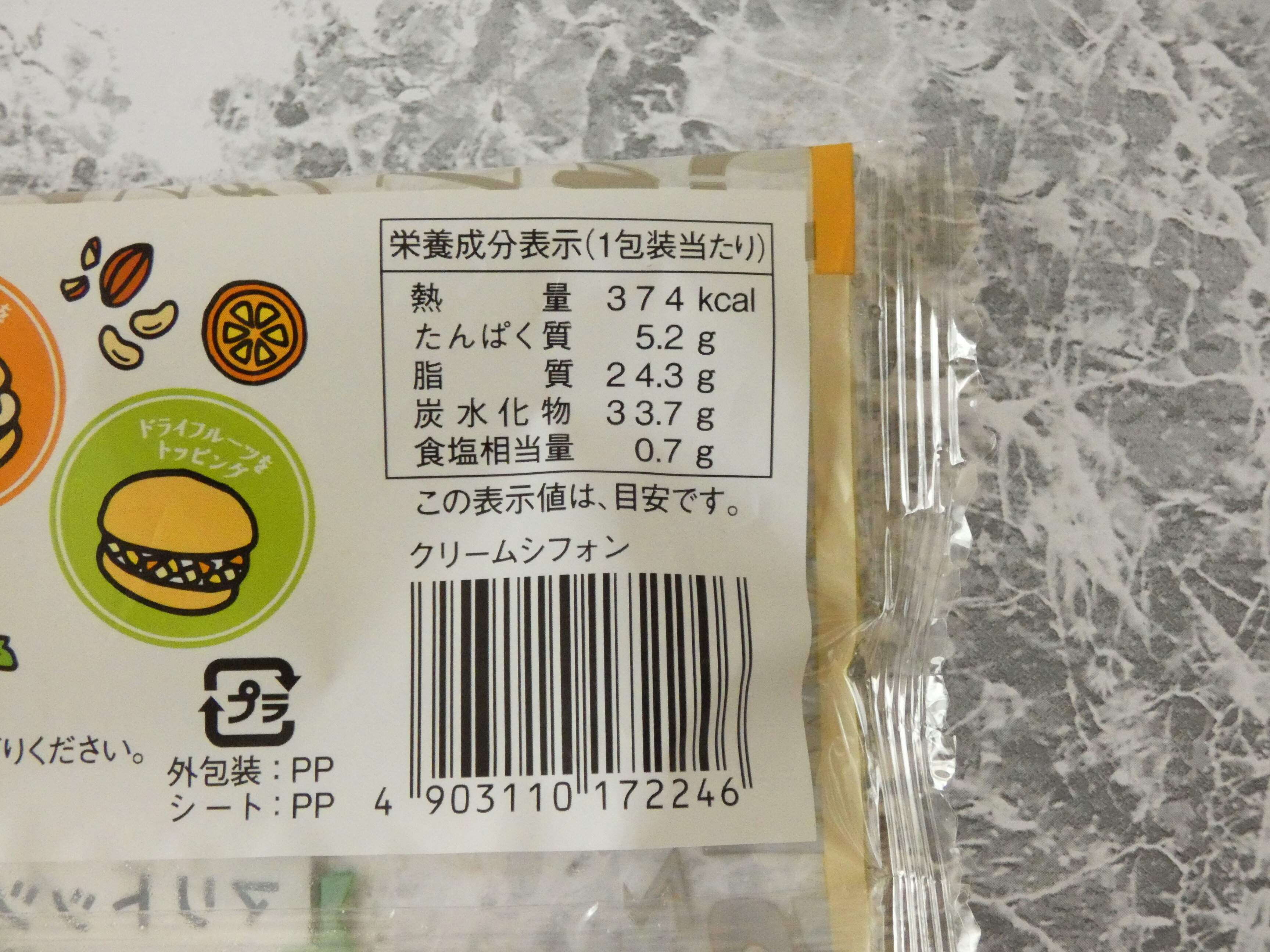 栄養成分表示を見ると1個のエネルギーは374kcal。生クリームたっぷりなのでカロリーも高めになっています。