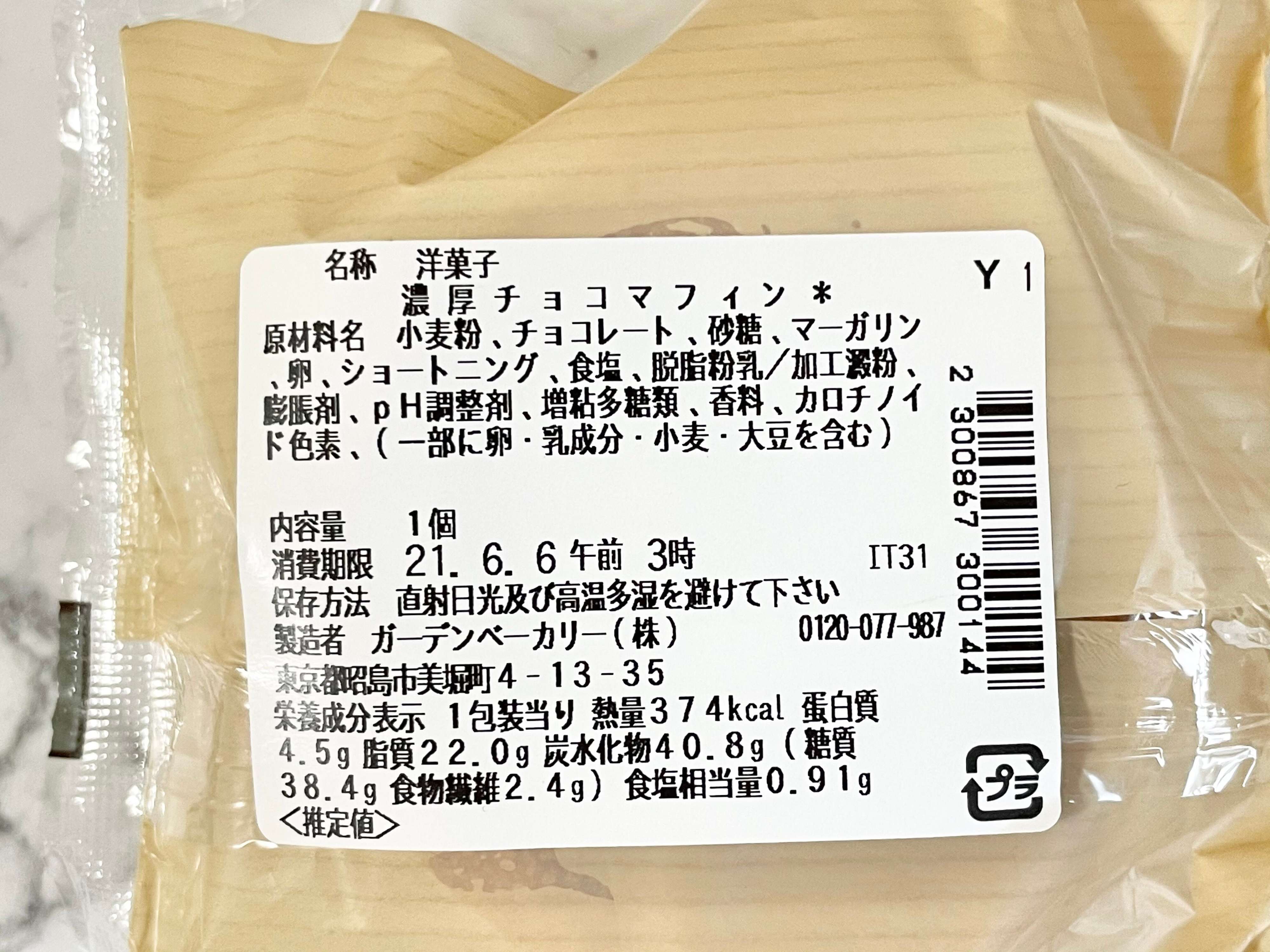 1個あたり374kcalと高めですが、濃厚チョコマフィンなのでこれには納得。食べたらしっかり働いて頭を使うことにします。