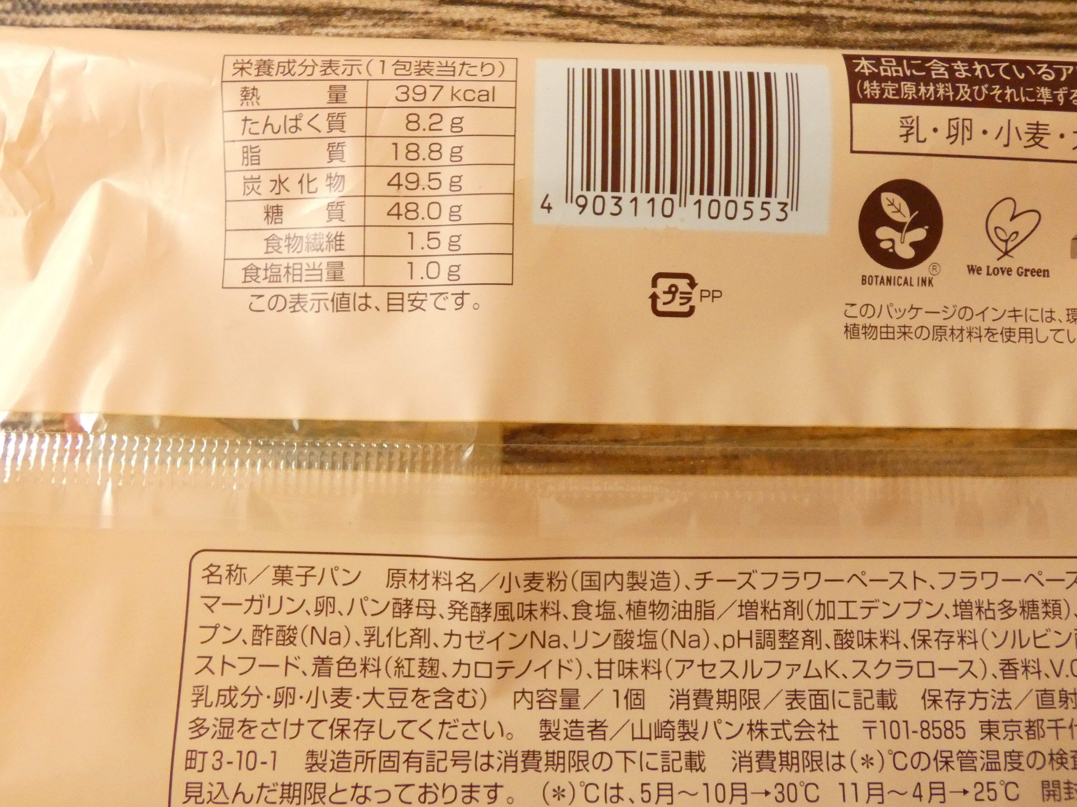 栄養成分表示を見ると1個のエネルギーは397kcal。このボリュームにクリームとチーズクリームが入っているので、予想通りのカロリーの高さです。