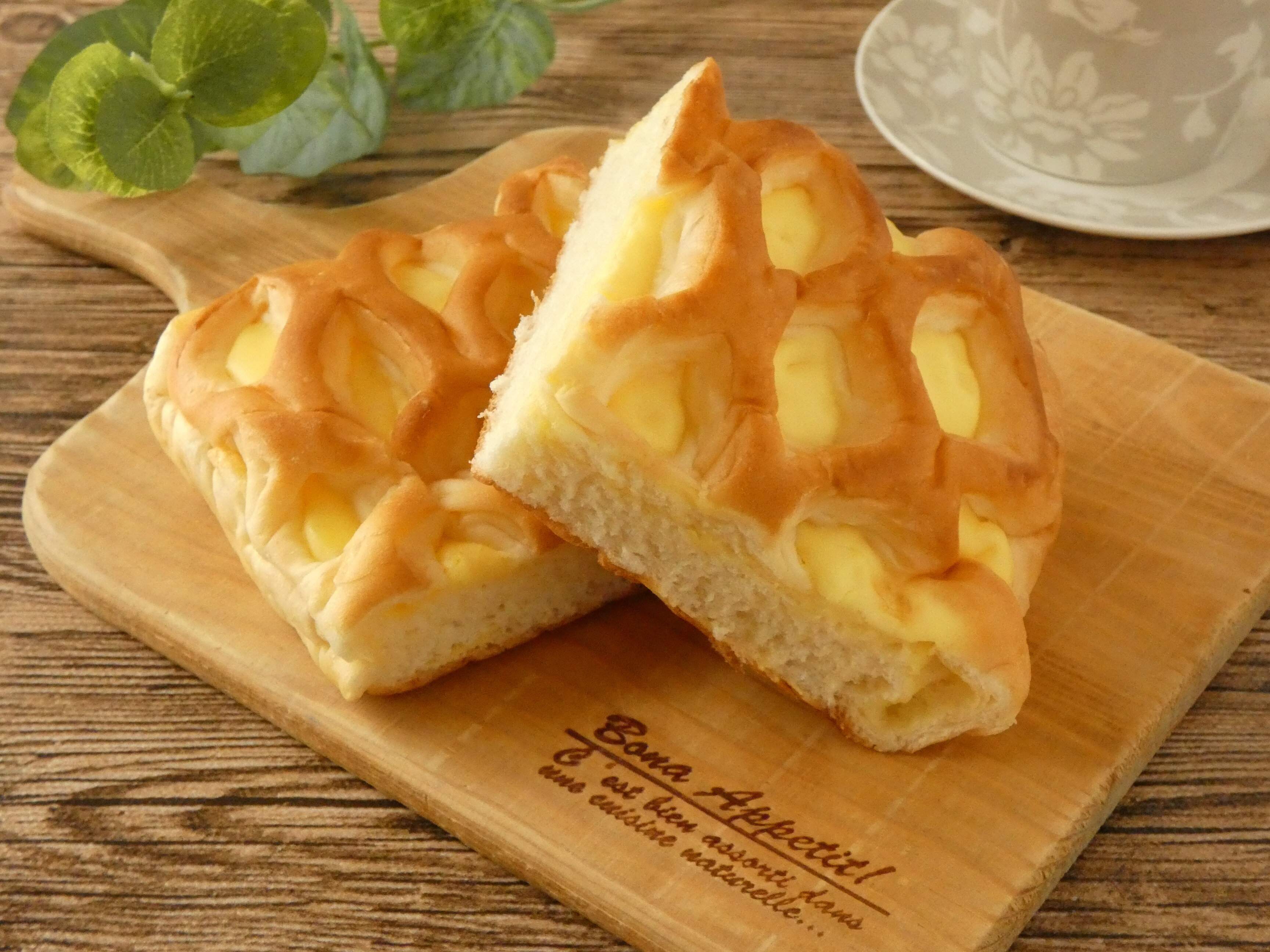 表面は編み目になっていて、ふわふわ柔らかいです。パン生地にはクリームが折り込まれていて、チーズクリームを絞って焼いてあります。