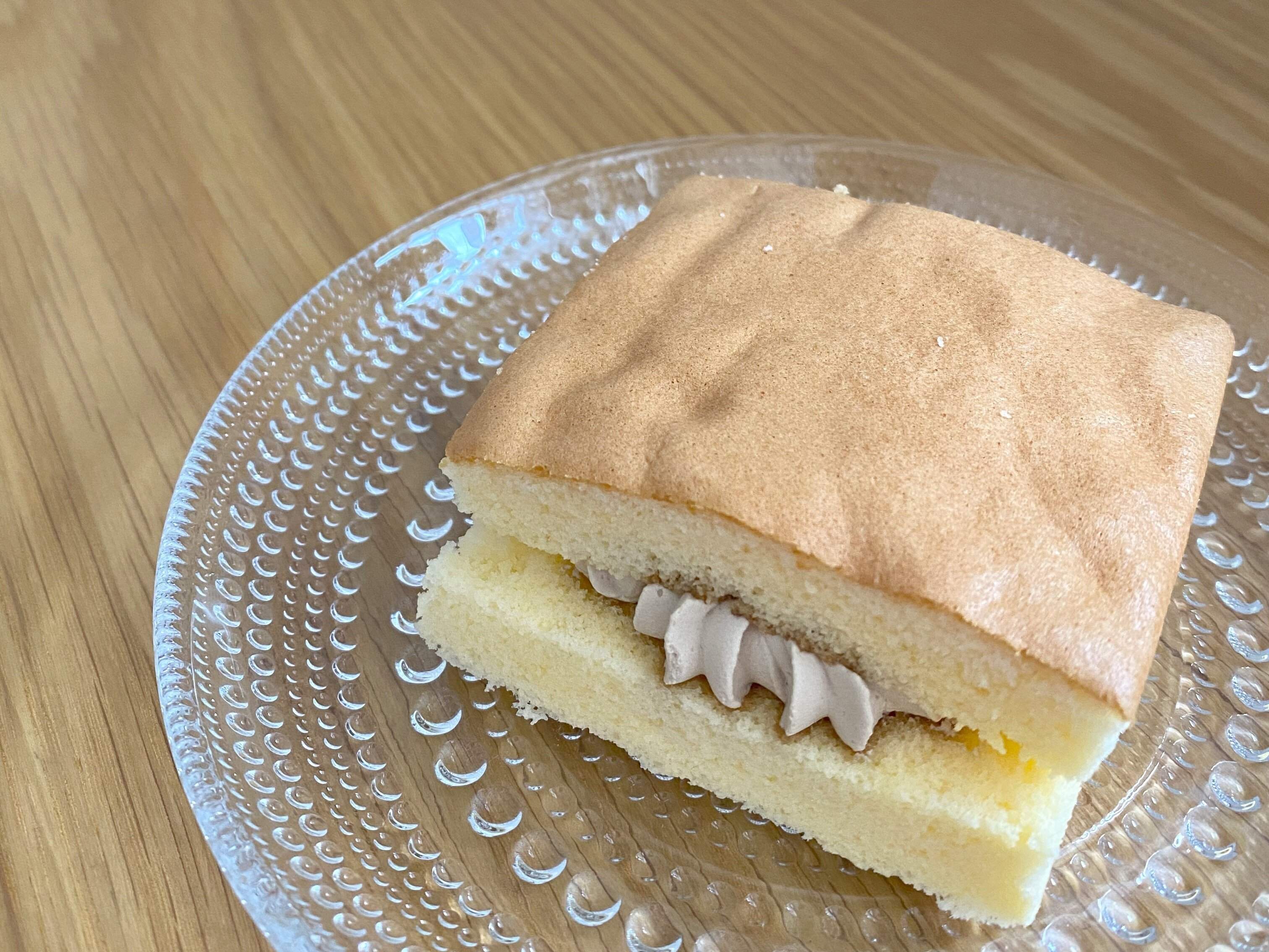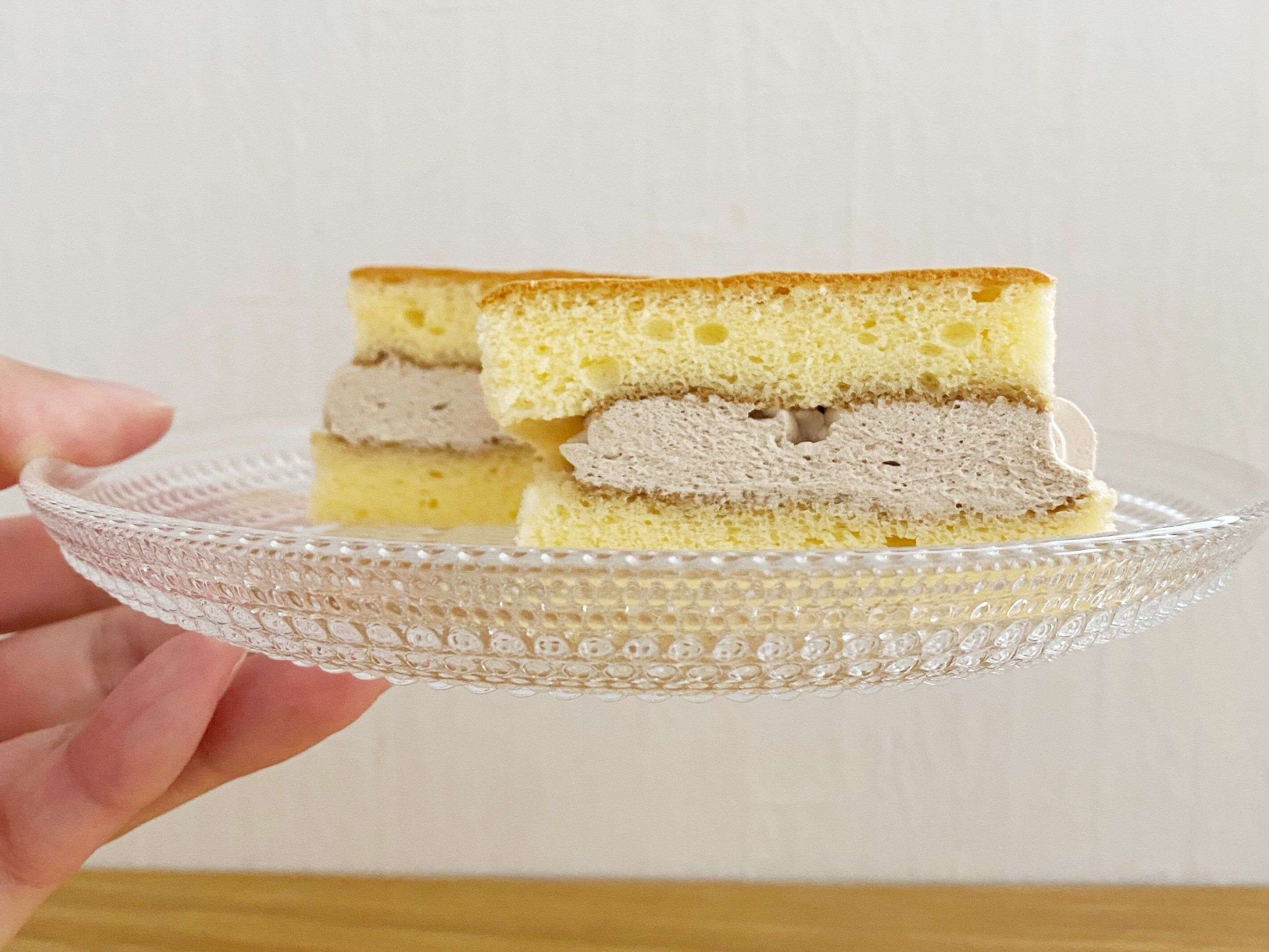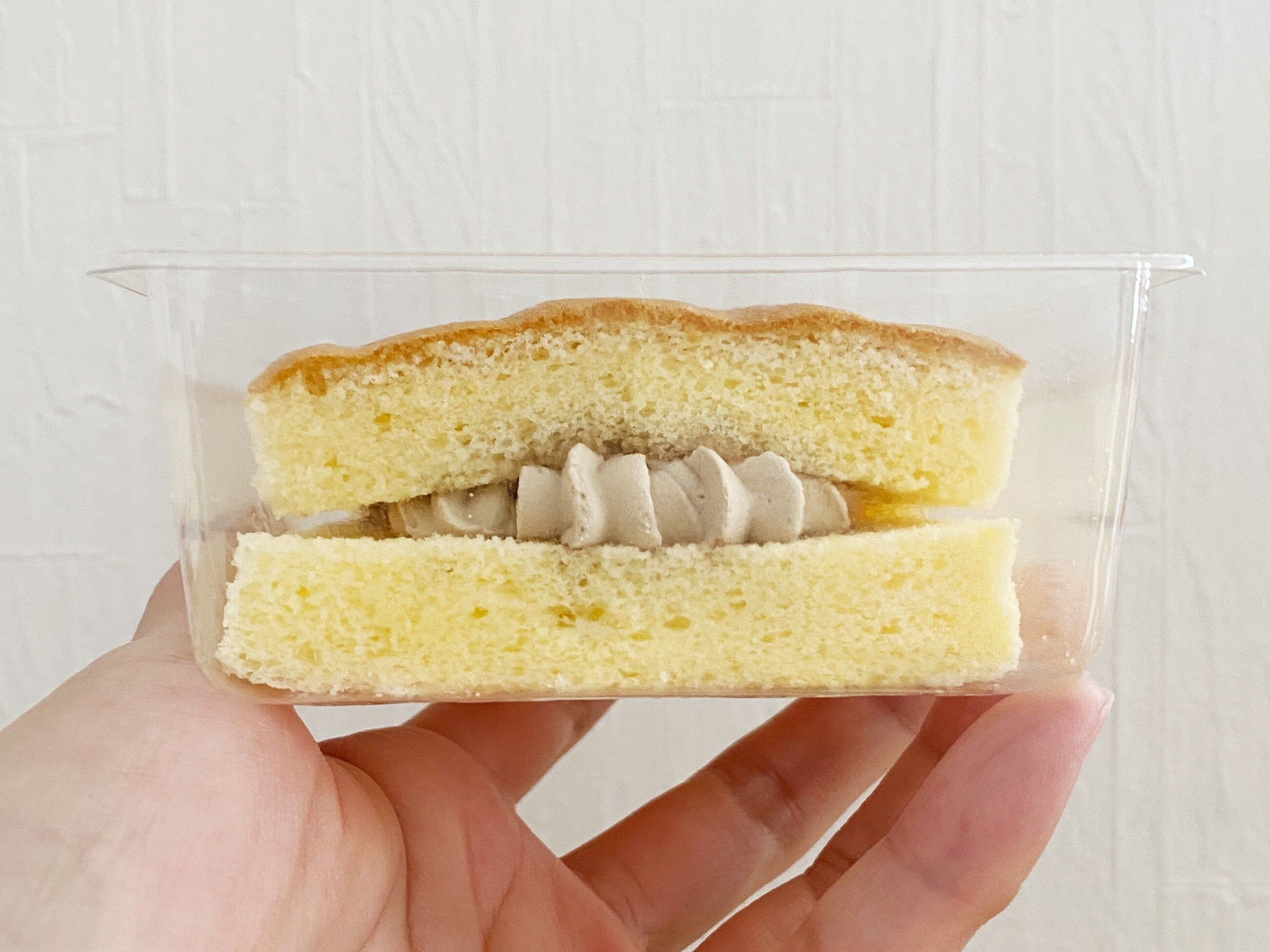 生地を持ち上げただけでもしっとり感やふわふわ感が伝わります。クリームがはみ出ているところが食欲をそそりますね。