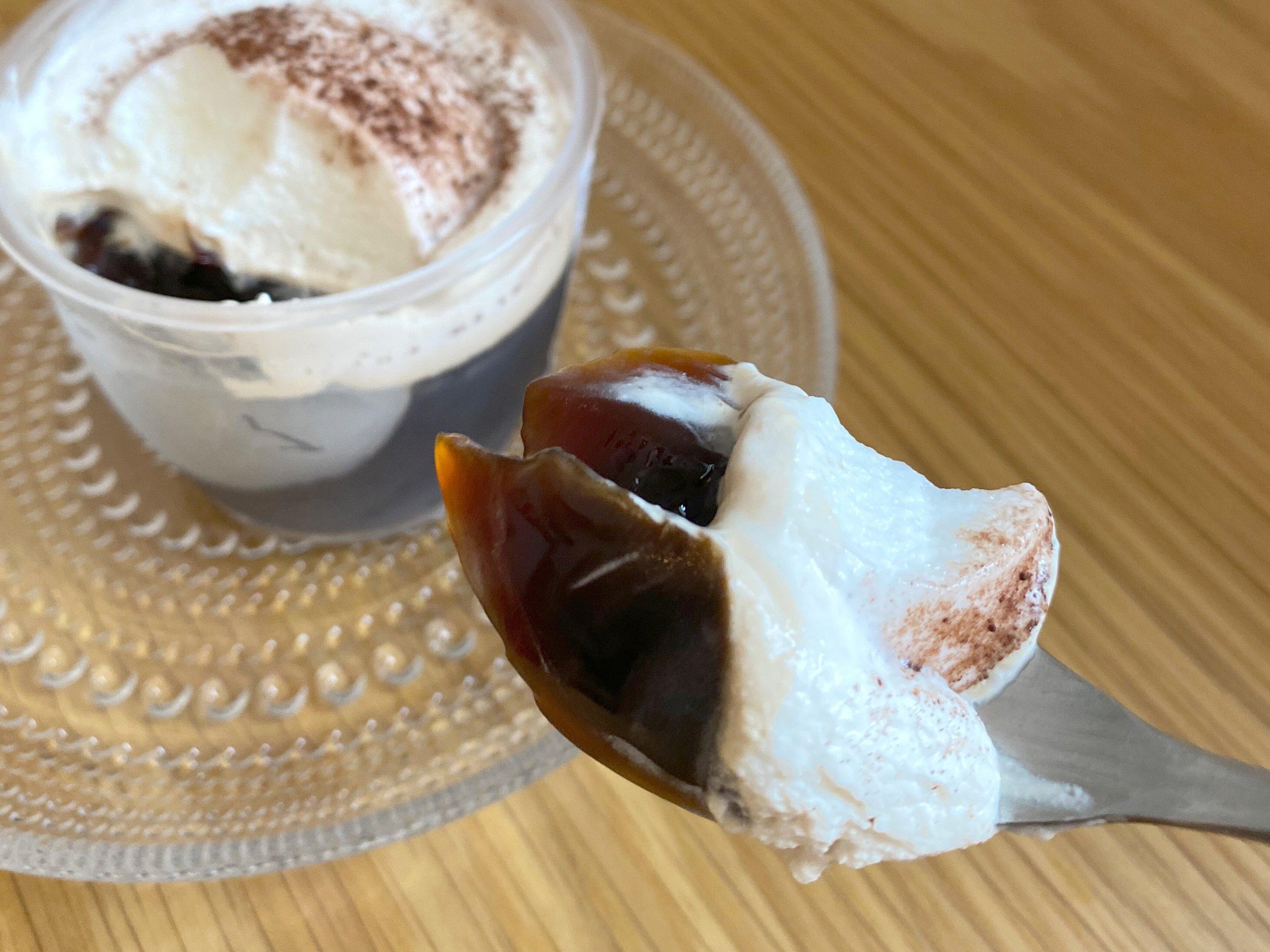 コーヒーゼリーは“ぷるんっ”と弾力のあるタイプのゼリーではなく、寒天のようなしっかりとした食感で、舌の上で押しつぶすと“プルプル”とくずれていきます。