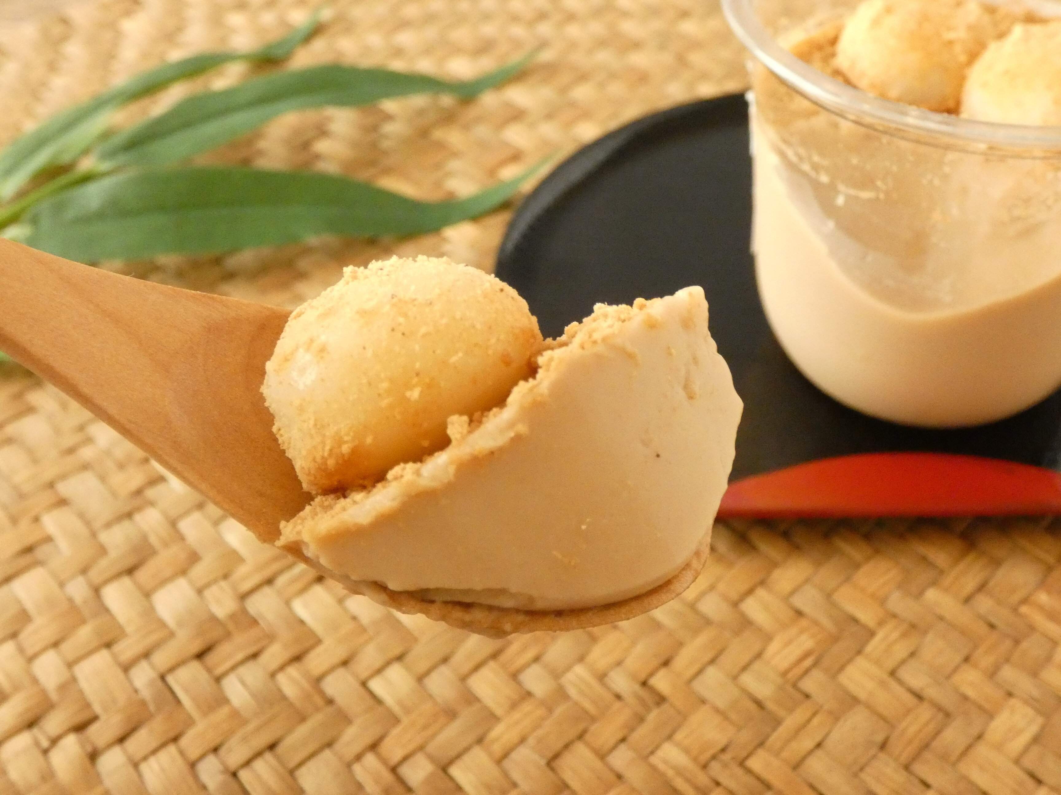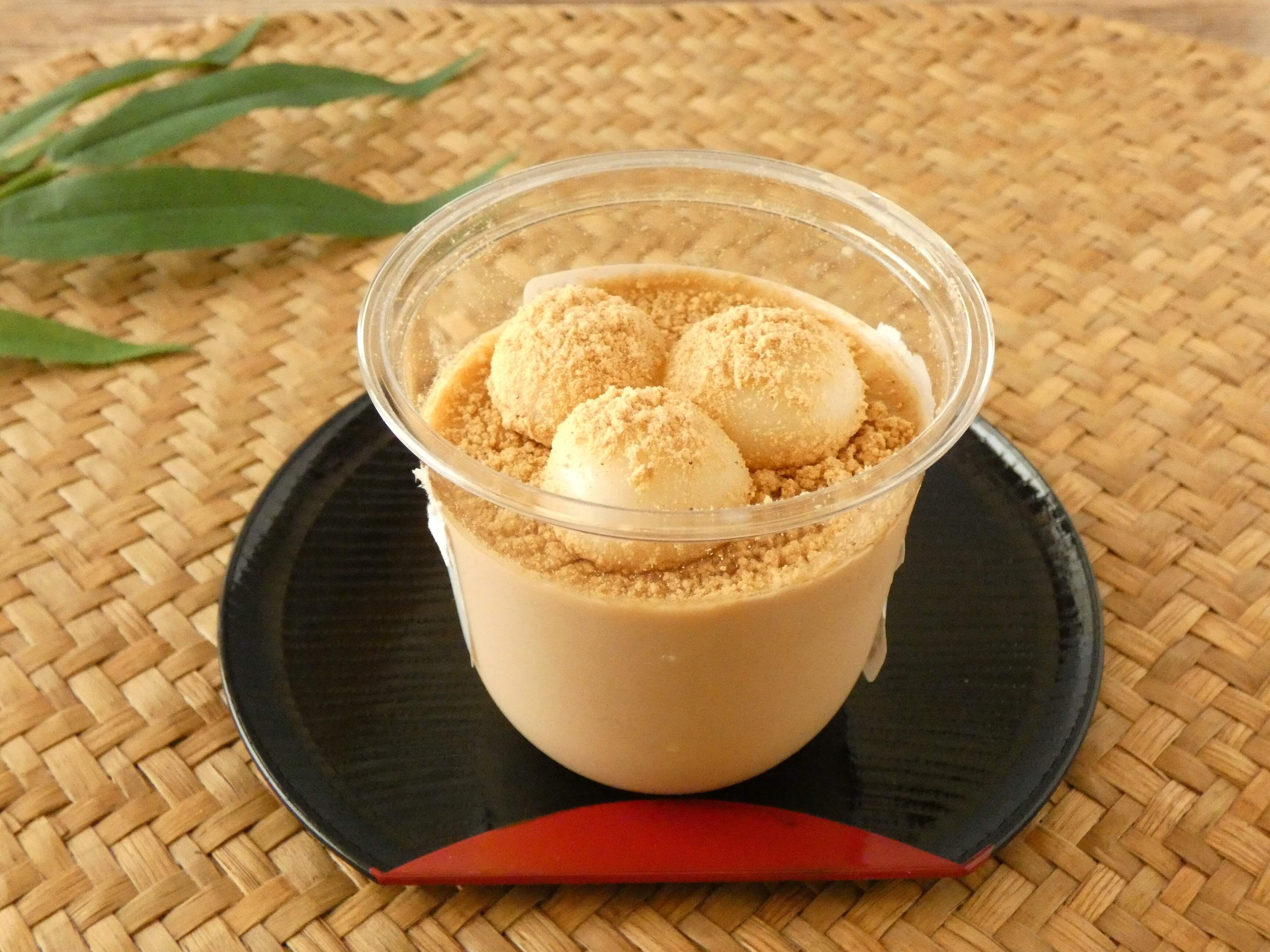 きな粉のプリンに白玉が3つ乗っていて、さらに上にはたっぷりきな粉がかかっています。ハチミツのように透き通ったキレイな色の黒糖蜜が別添されています。