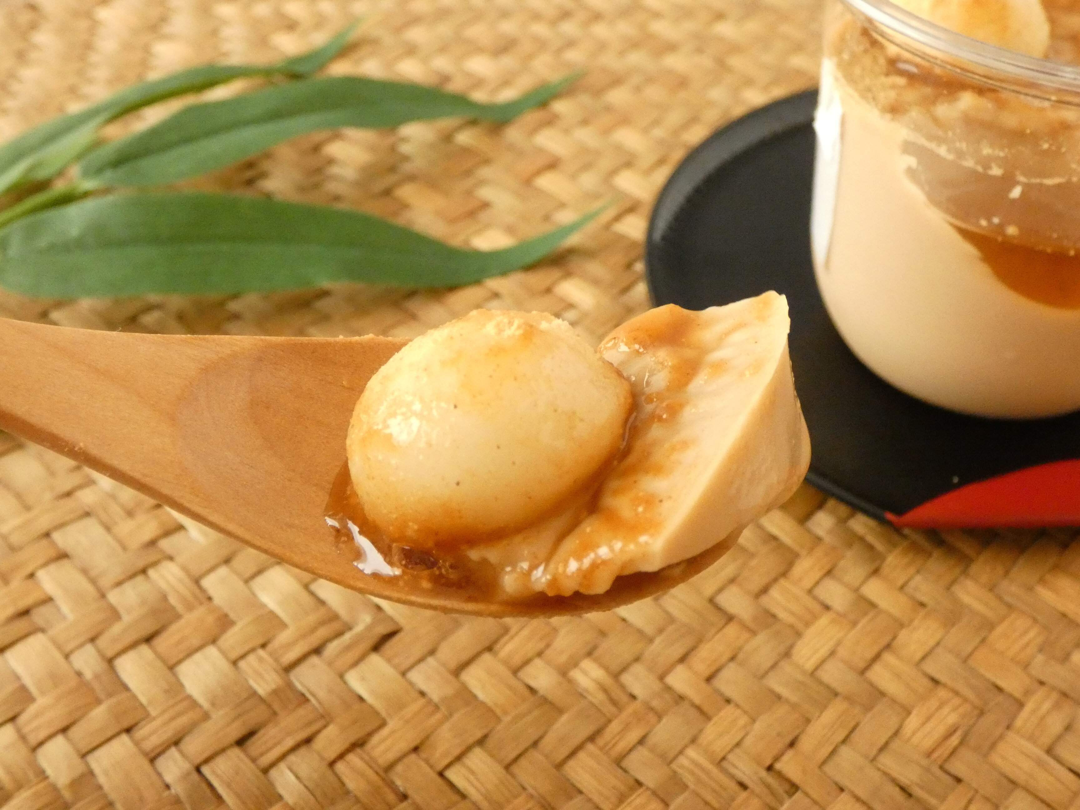 黒糖蜜をかけるとちょうどいい甘さになりました。さっぱりした黒糖蜜をかけてお好みで調節できます。プリンなのに餅系の和菓子を食べているような食感に大満足。和菓子好きな方にオススメなので、是非お試しください。
