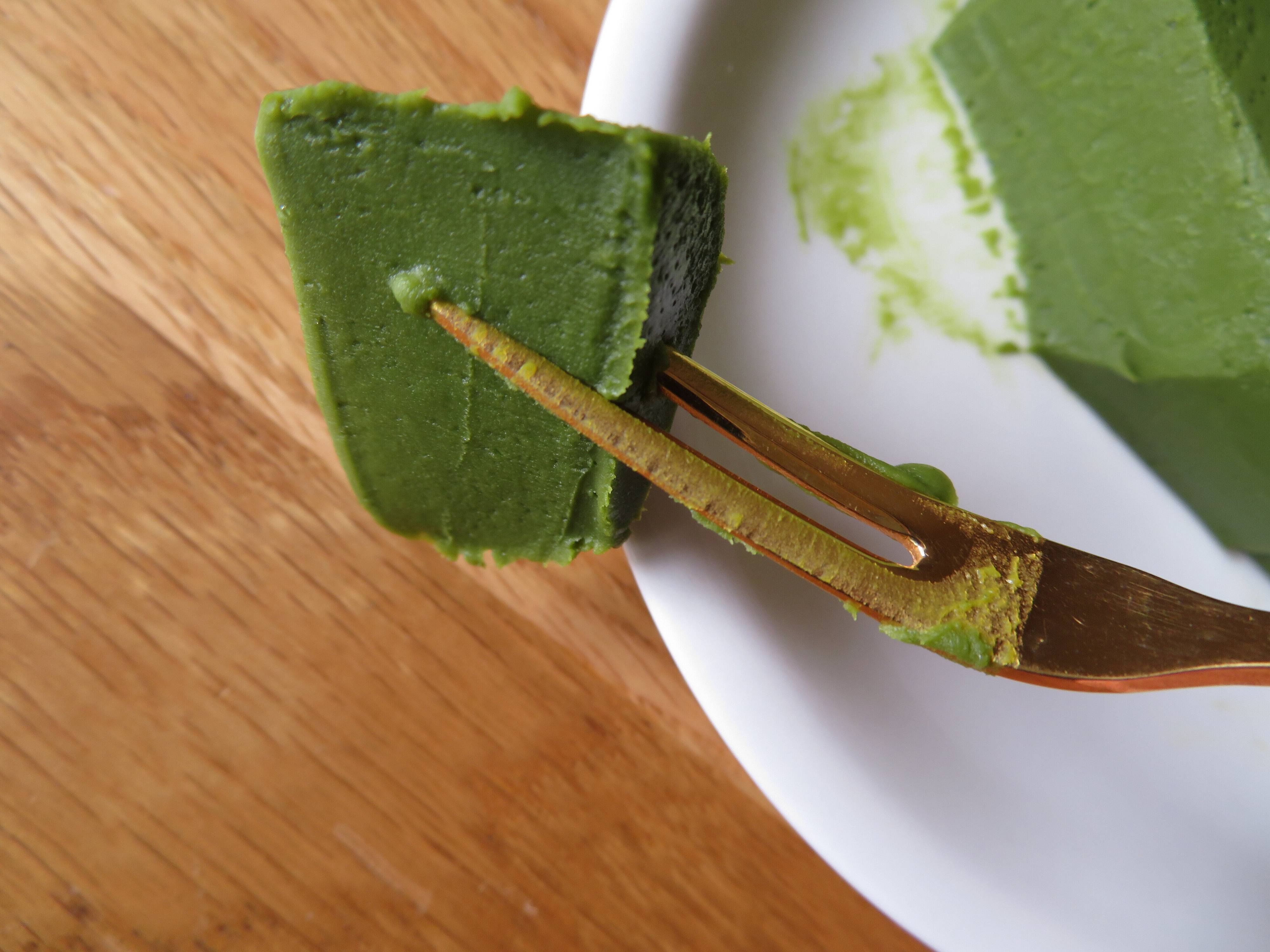 ほどよい抹茶の苦みとうまみが調和し、クリームのコクもしっかりあります。ふわふわで口に入れた瞬間なくなるムースとは違い、少し硬さもありながら舌の上でゆっくりと溶けていく感じ。