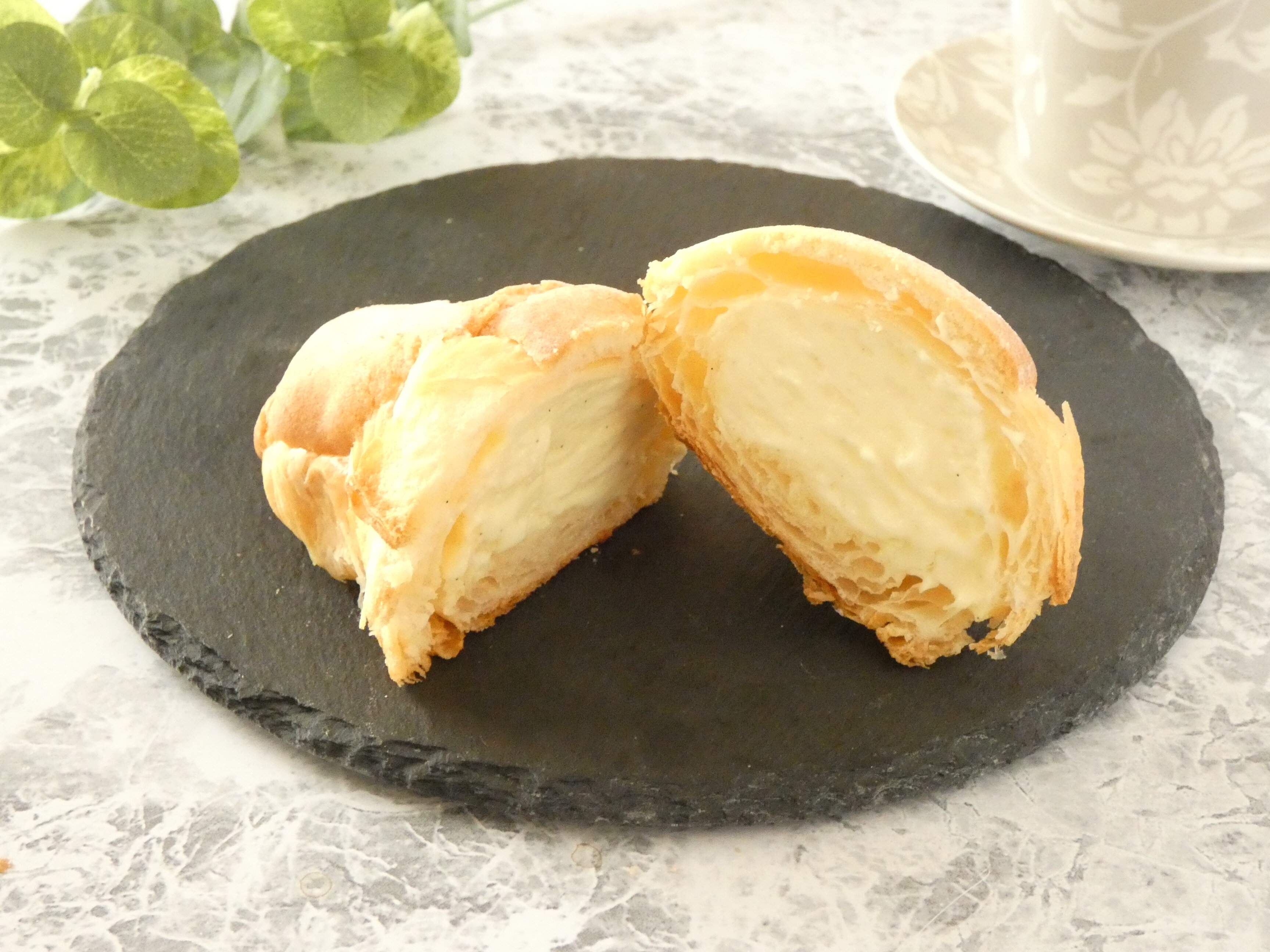 切ってみるとクッキー生地の下にはふんわりとしたクロワッサンの層があり、中にはカスタードホイップがたっぷり。