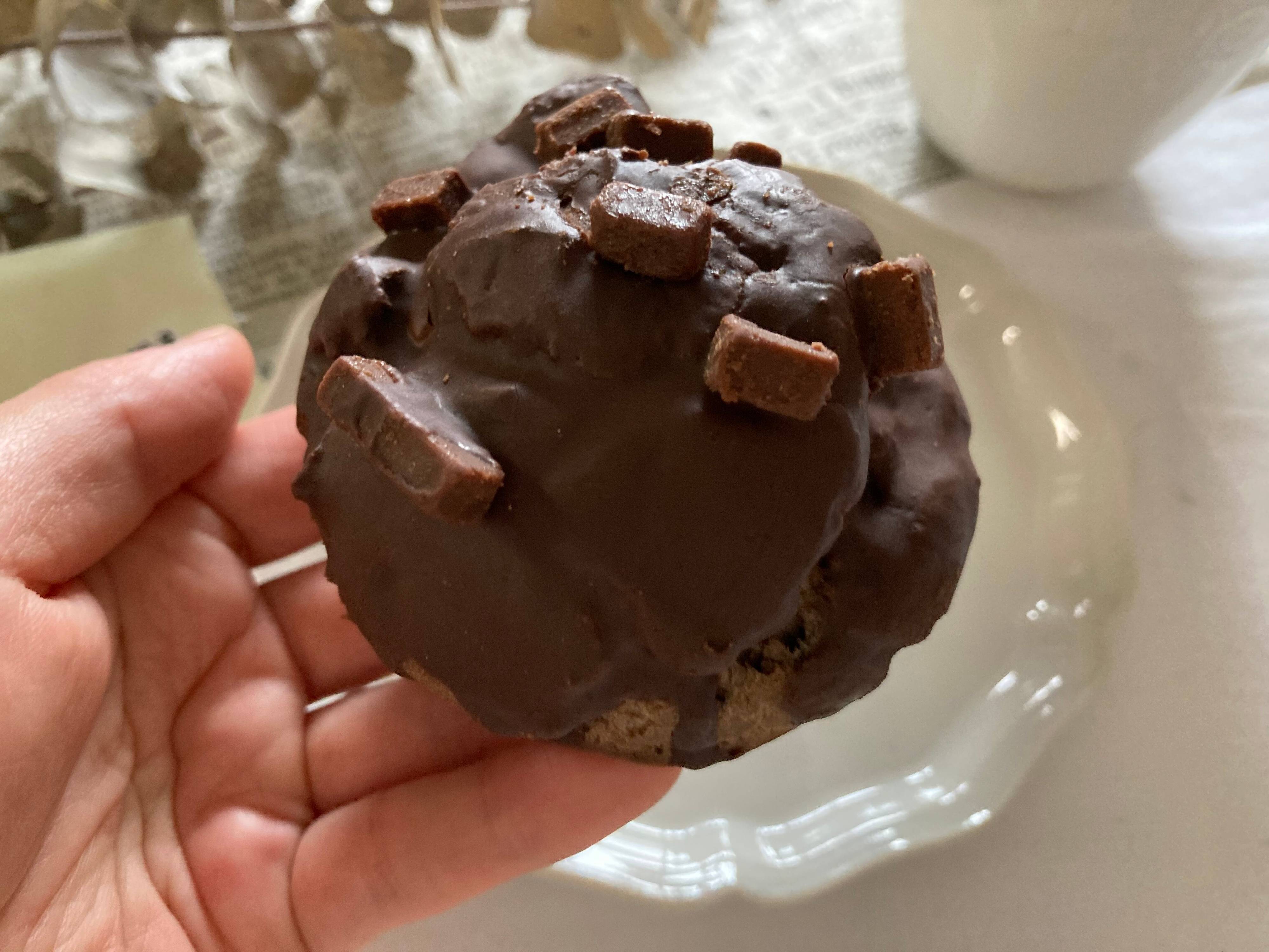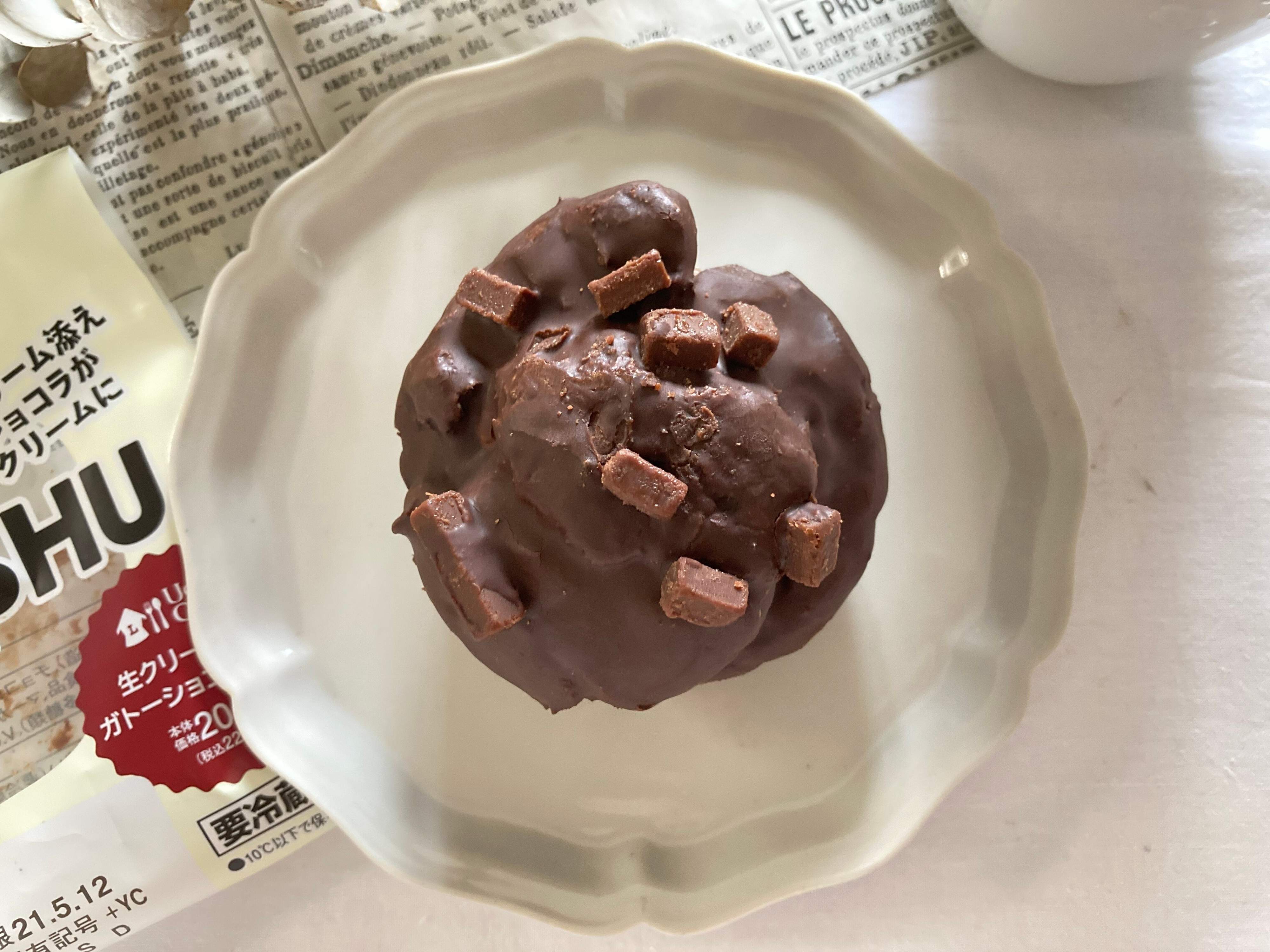 袋から開けてみると、チョコレートコーティングされたシュークリームが登場。上には生チョコダイスがトッピングされています。