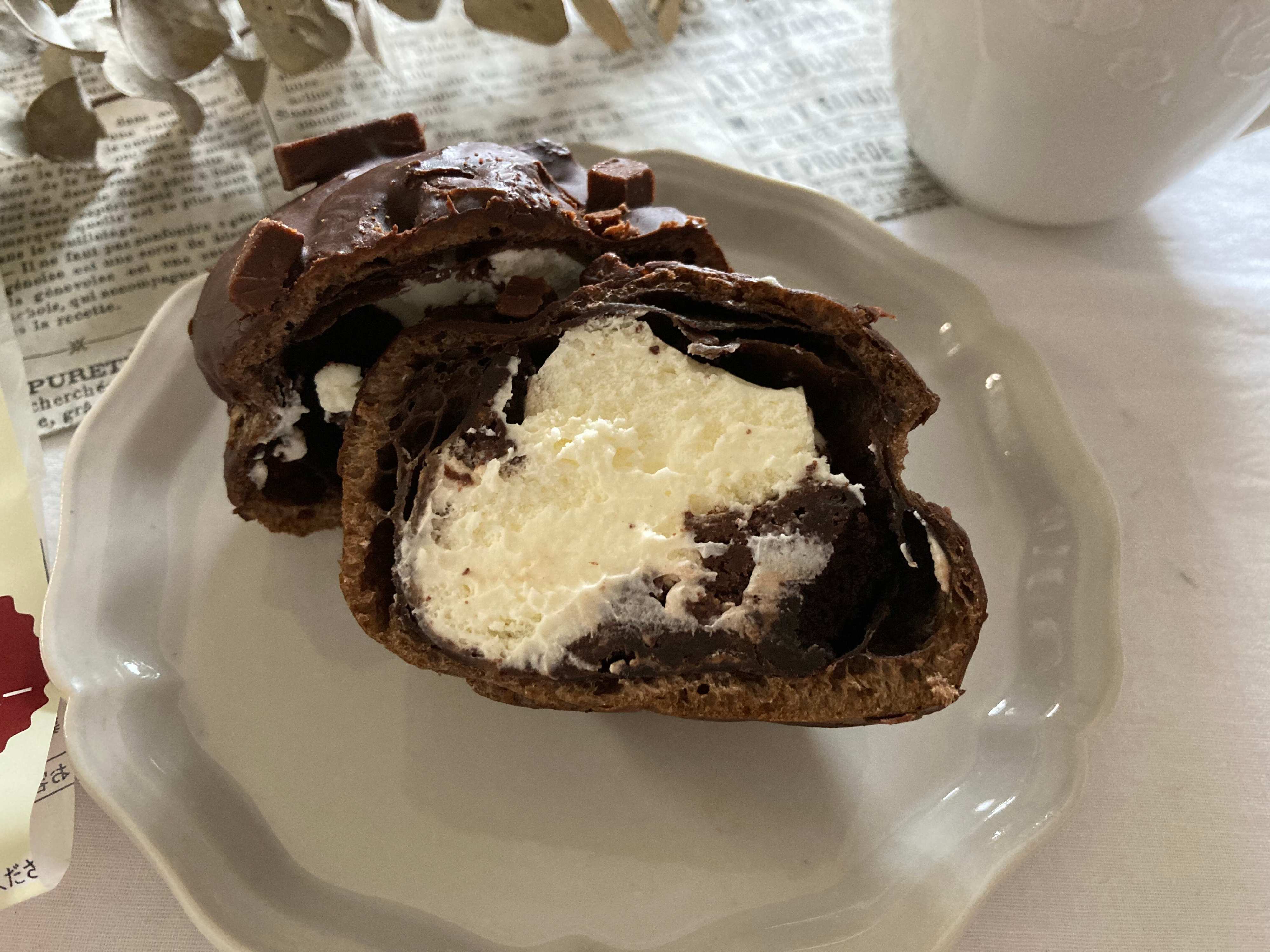 半分にカットしてみると、シュー生地の中にガトーショコラと生クリームがたっぷりと入っています。生クリームは2種類の北海道産生クリームが入っているそうです。