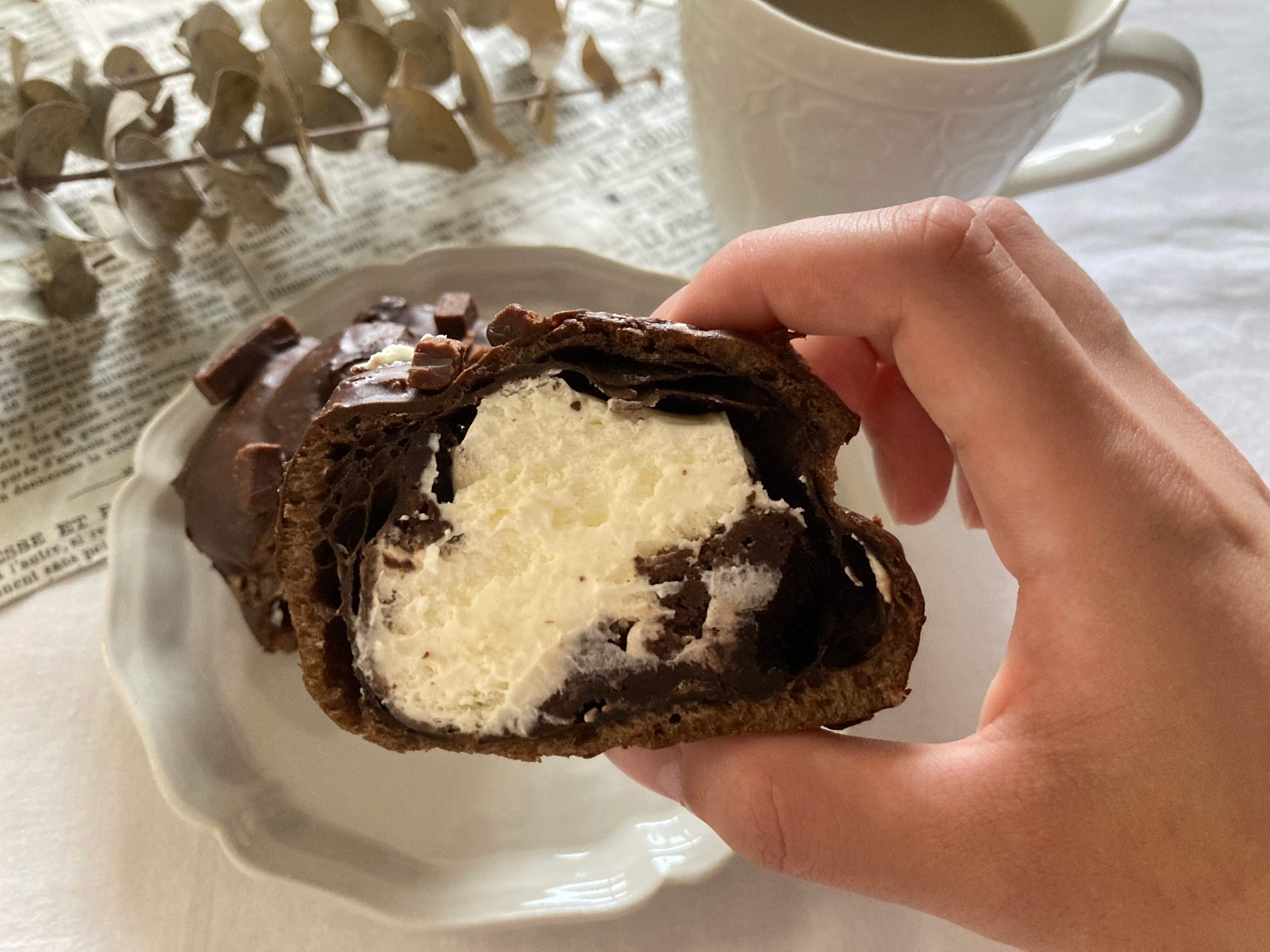 大のチョコレート好きの私が新商品をチェックしていた時、真っ先に食べたいって思った商品です。名前から想像できるかもしれませんが、シュークリームの中にガトーショコラが入った新感覚シュークリームです。