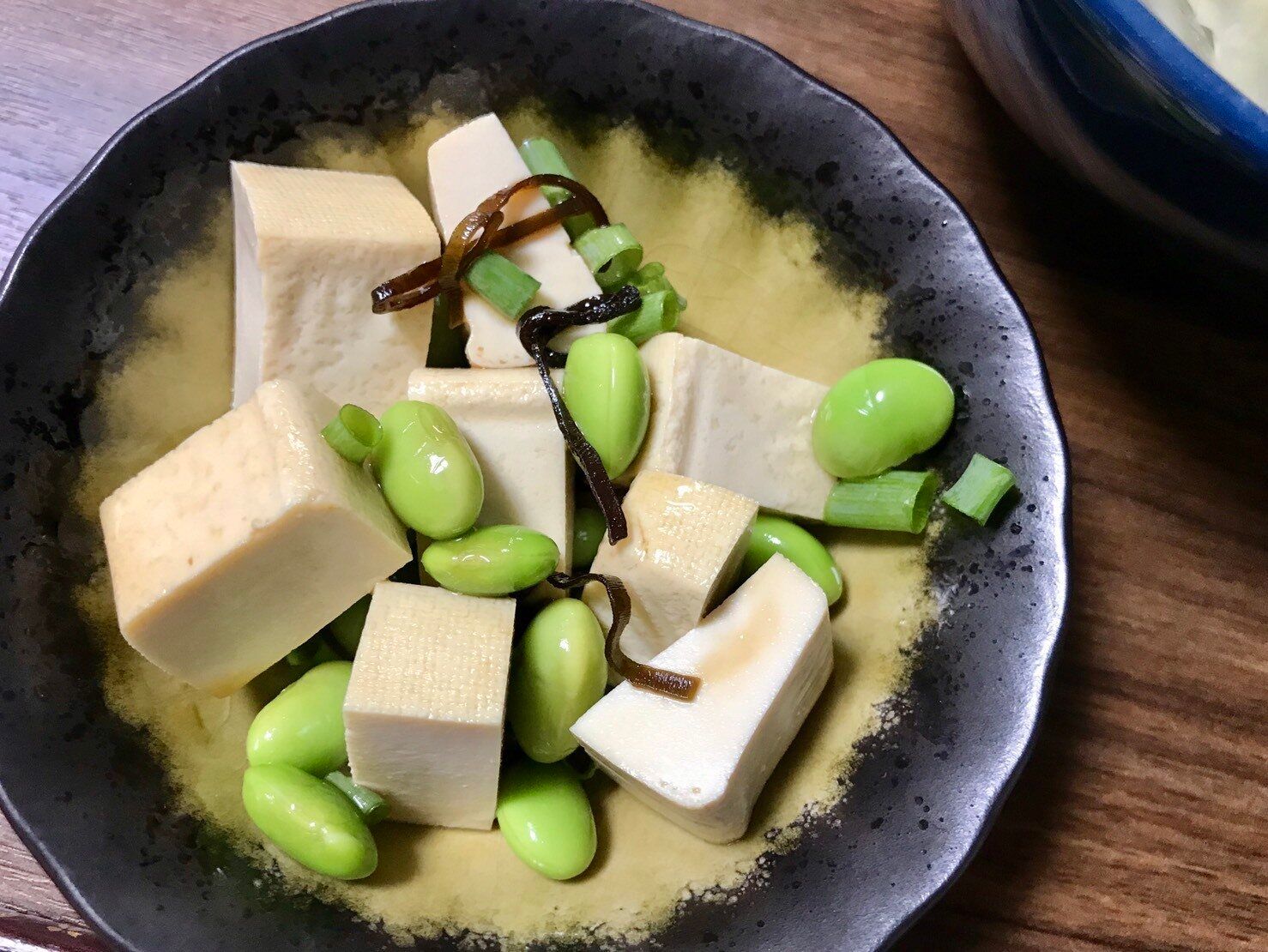 豆腐バーはカットして、枝豆・塩昆布・醤油で和えておつまみ風副菜に。豆腐バーは弾力があり、箸で持っても崩れにくく食べやすいです。