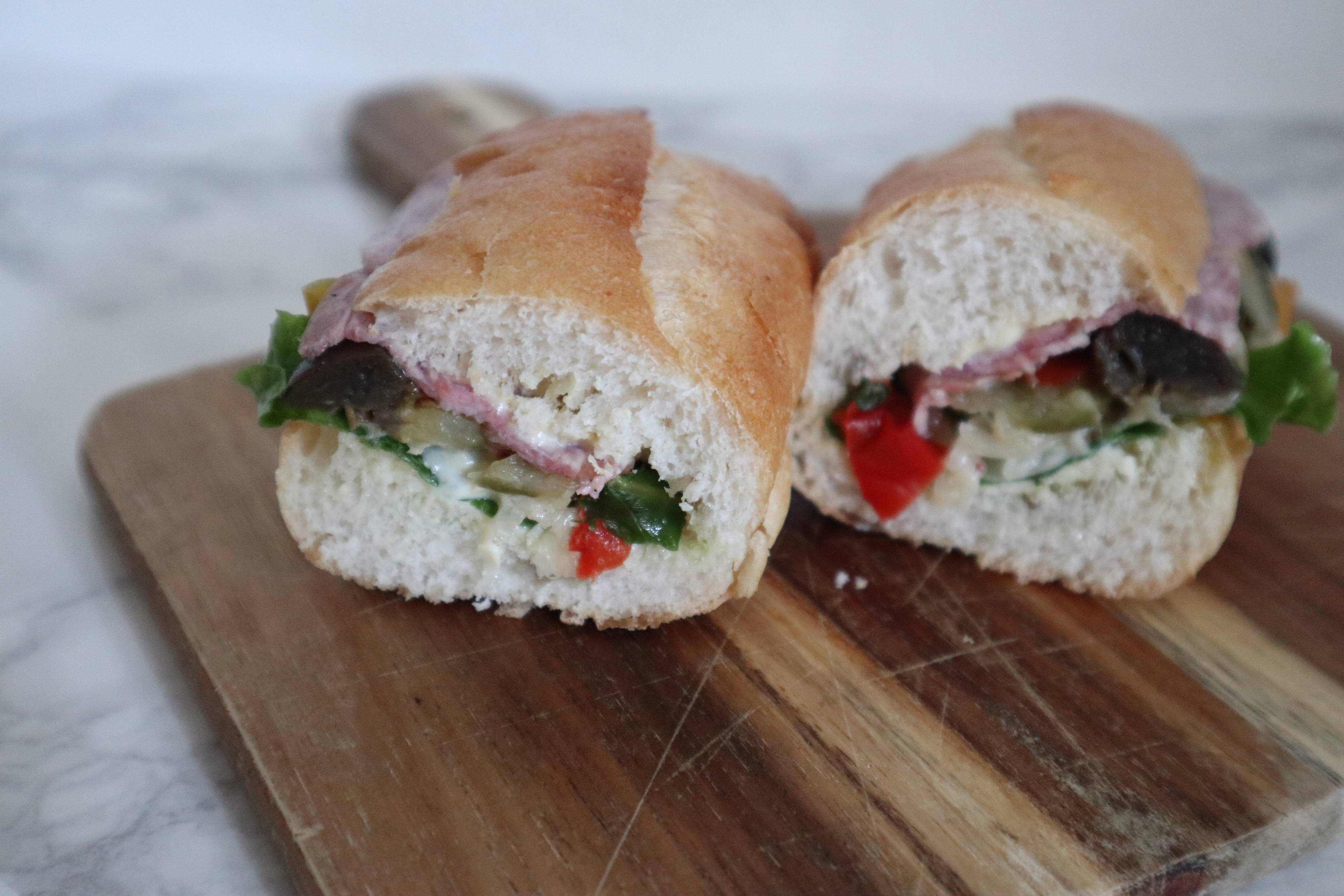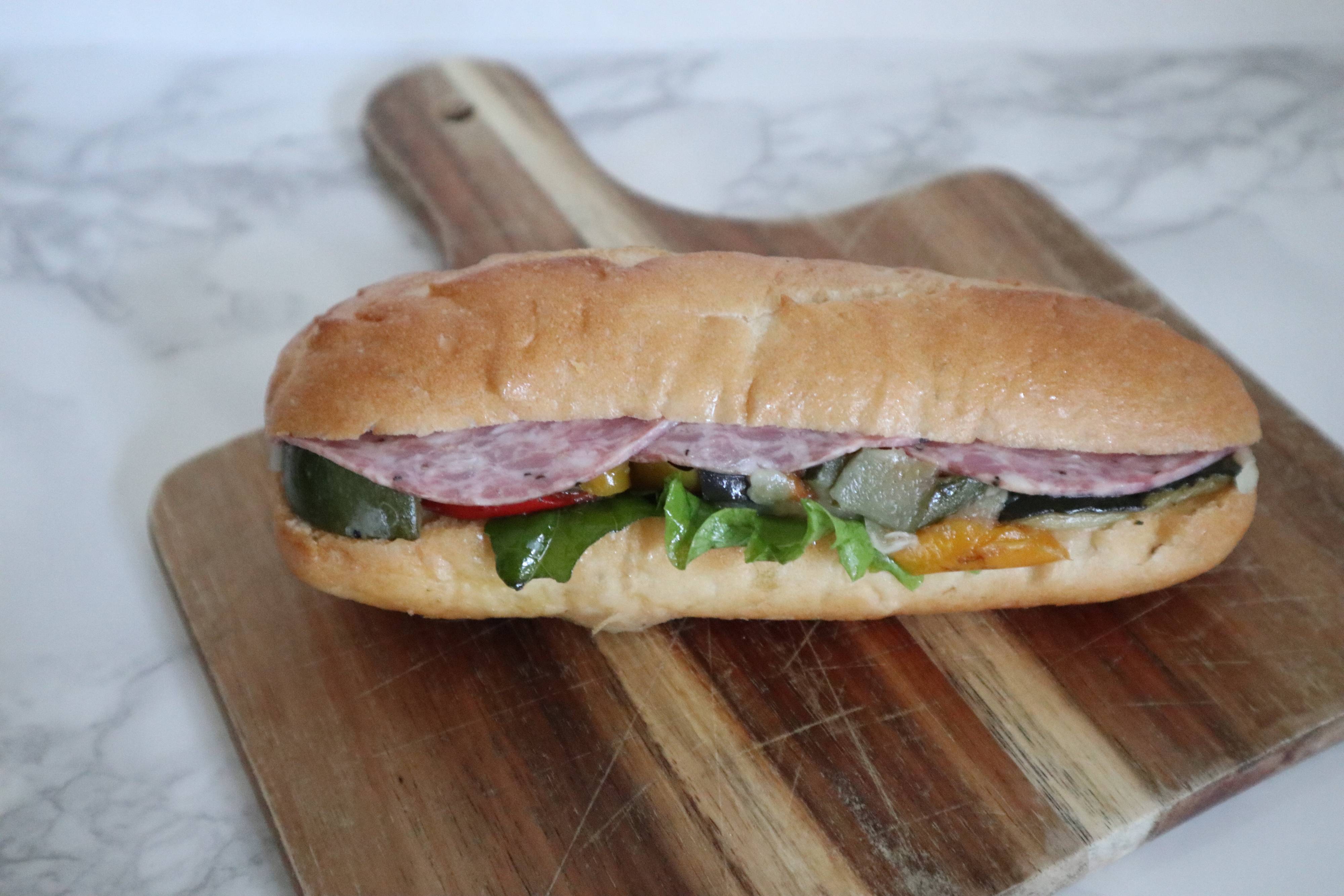 具材がぎっしり。ハニーマスタードマヨネーズソース、ソフトサラミ、リーフレタス、玉ねぎ、オリーブオイルで和えたグリル野菜(ズッキーニ、茄子、パプリカ)が挟んであります。オーブントースターでトーストすると香ばしくなり、さらに美味しいです。
