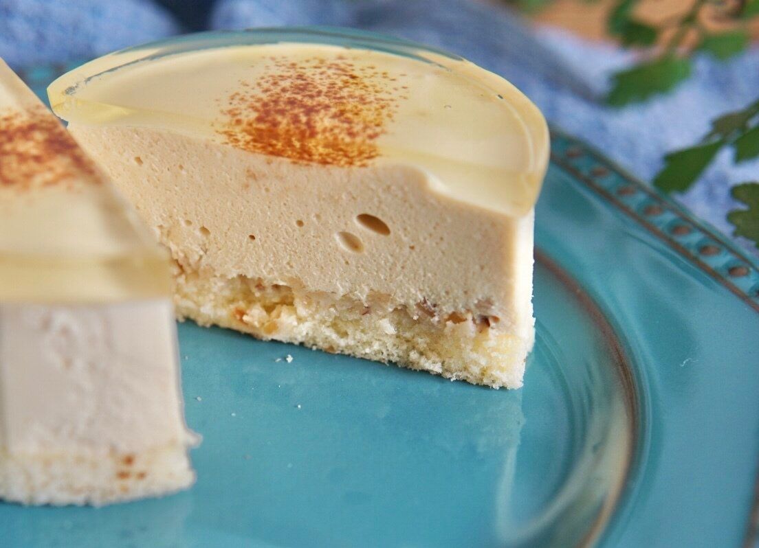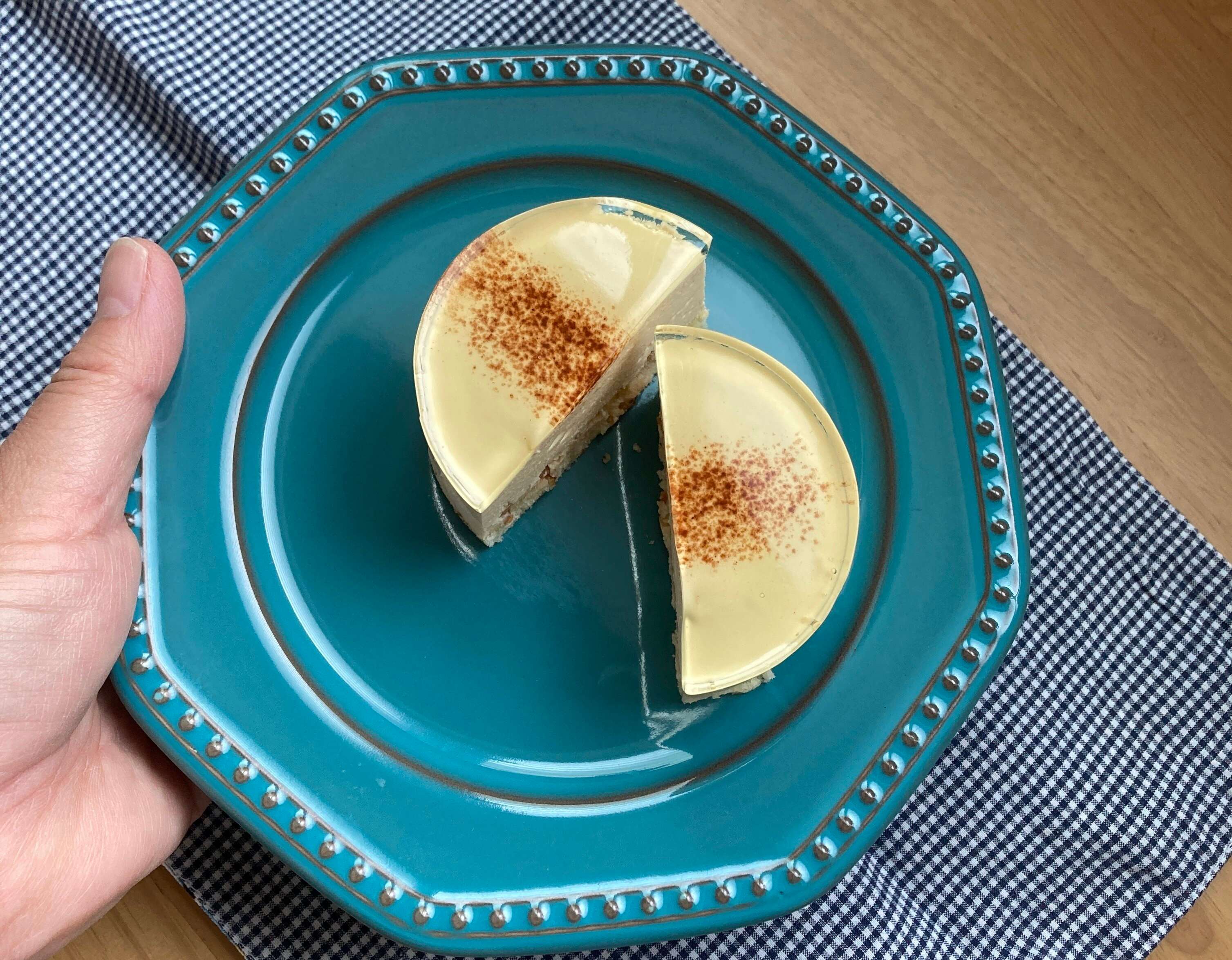 外のフィルムを取って半分でカットしても崩れない。けれども、ゼリーのような固さではなく、すぐ下にあるキャラメルチーズケーキの舌触りのなめらかさに負けないくらいのとろけ具合です。