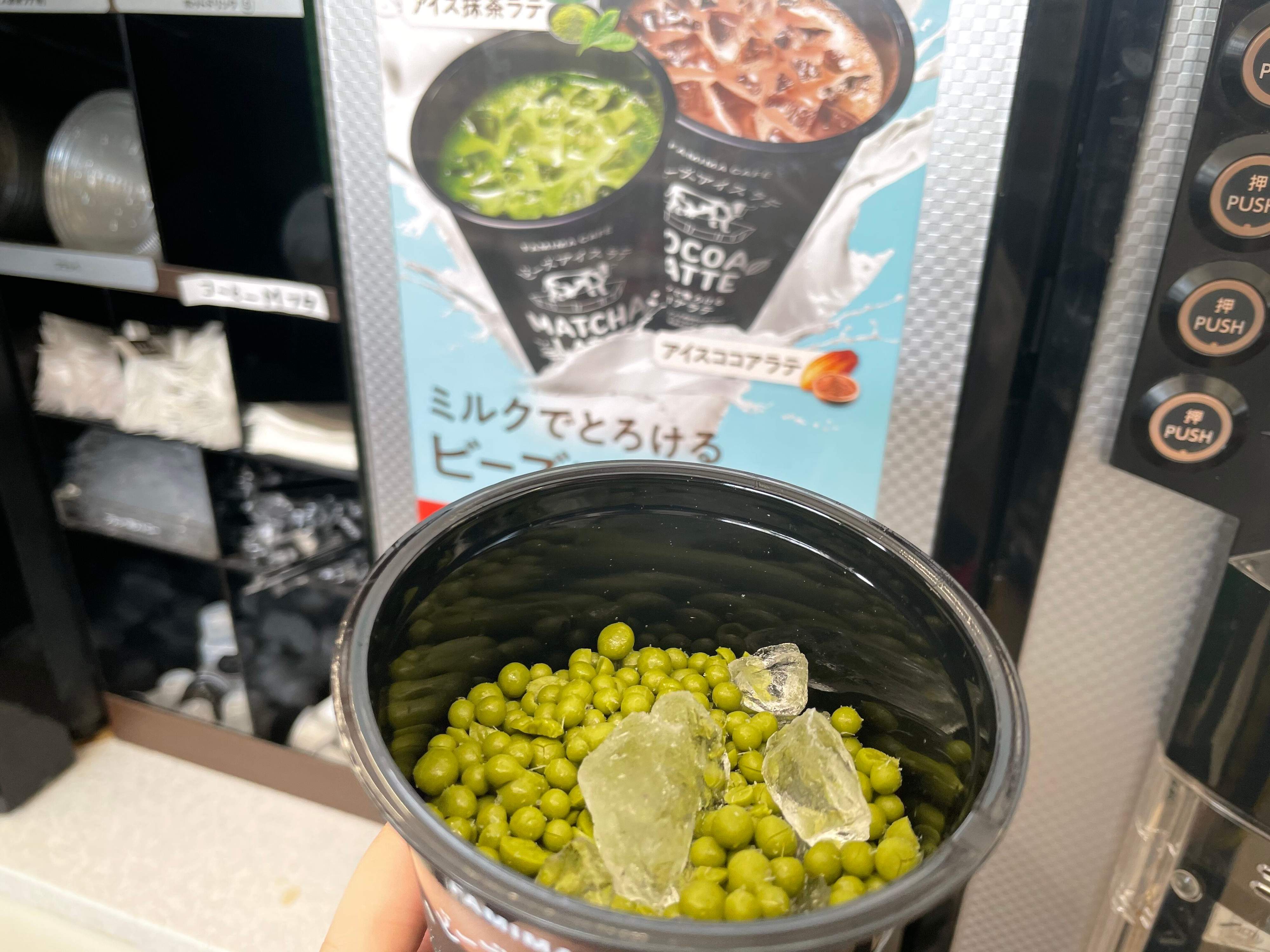 冷凍ケースにある、抹茶ビーズのカップを購入してレジで精算。カップを開けてみると、抹茶ビーズと氷が入っています。