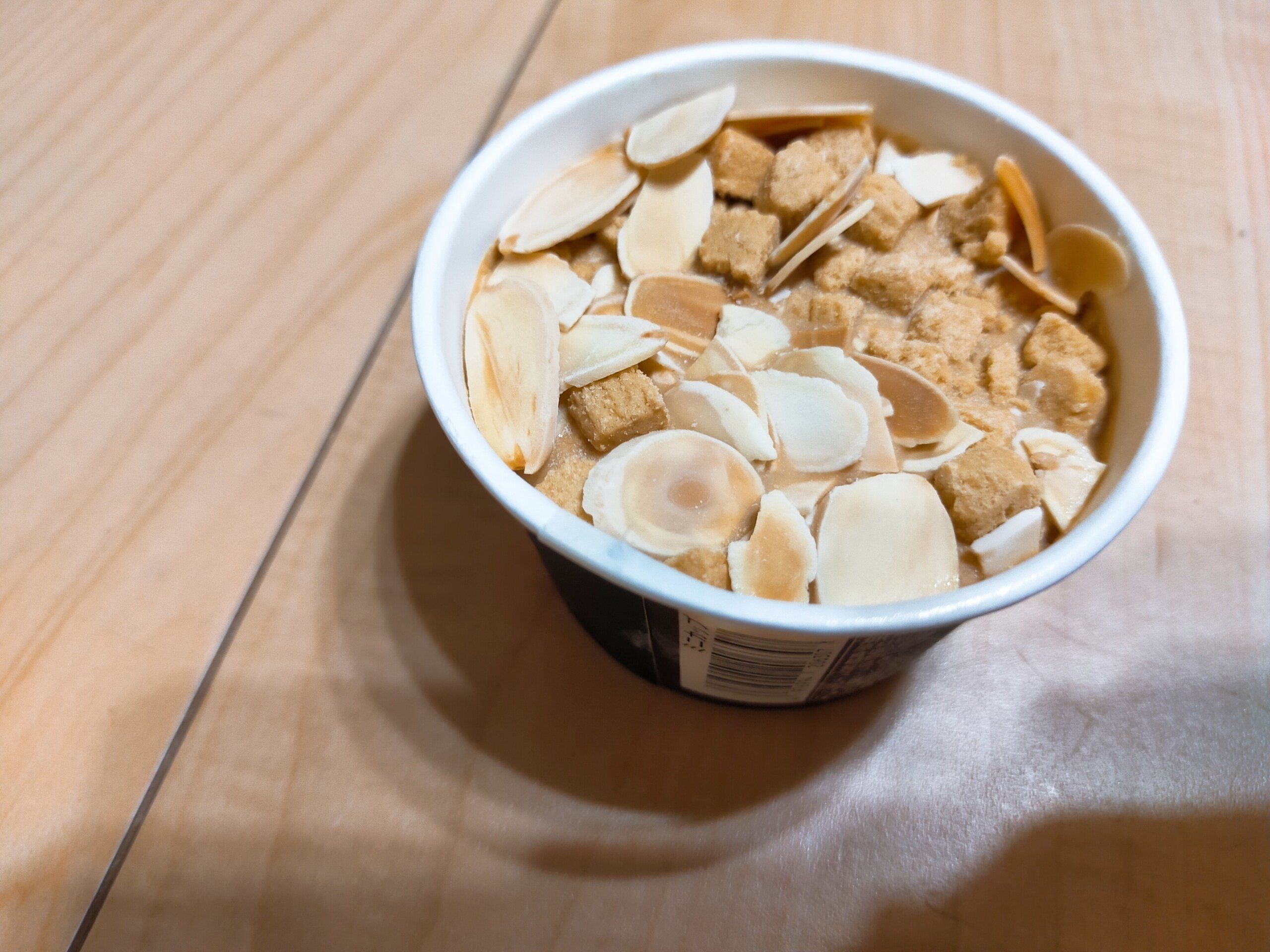 パリパリの秘密はスライスアーモンド。スプーンでもパリッと行く香ばしさで、キャラメルアイスクリームと良く合います。ザクザクの秘密は、細く砕かれたバタークッキー!